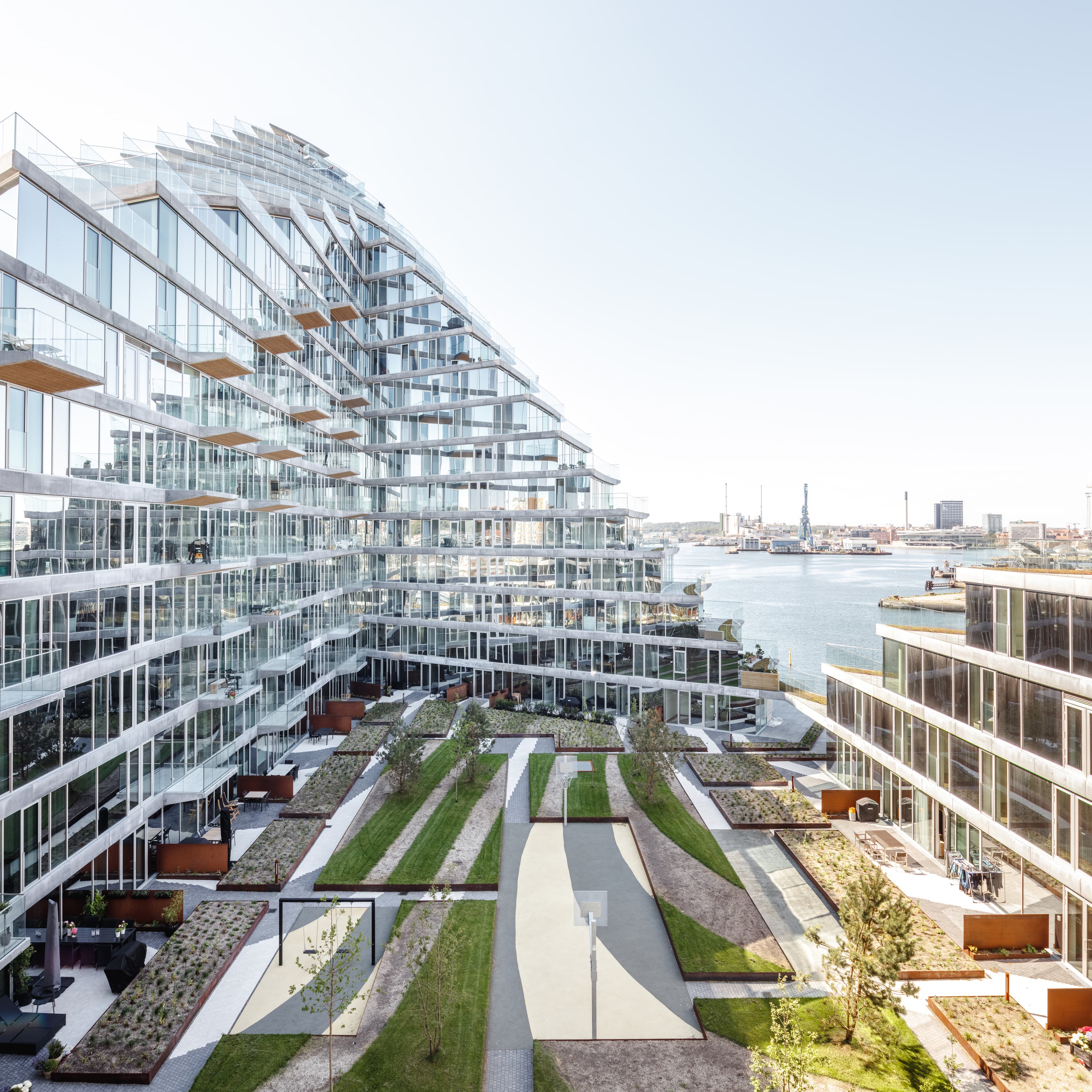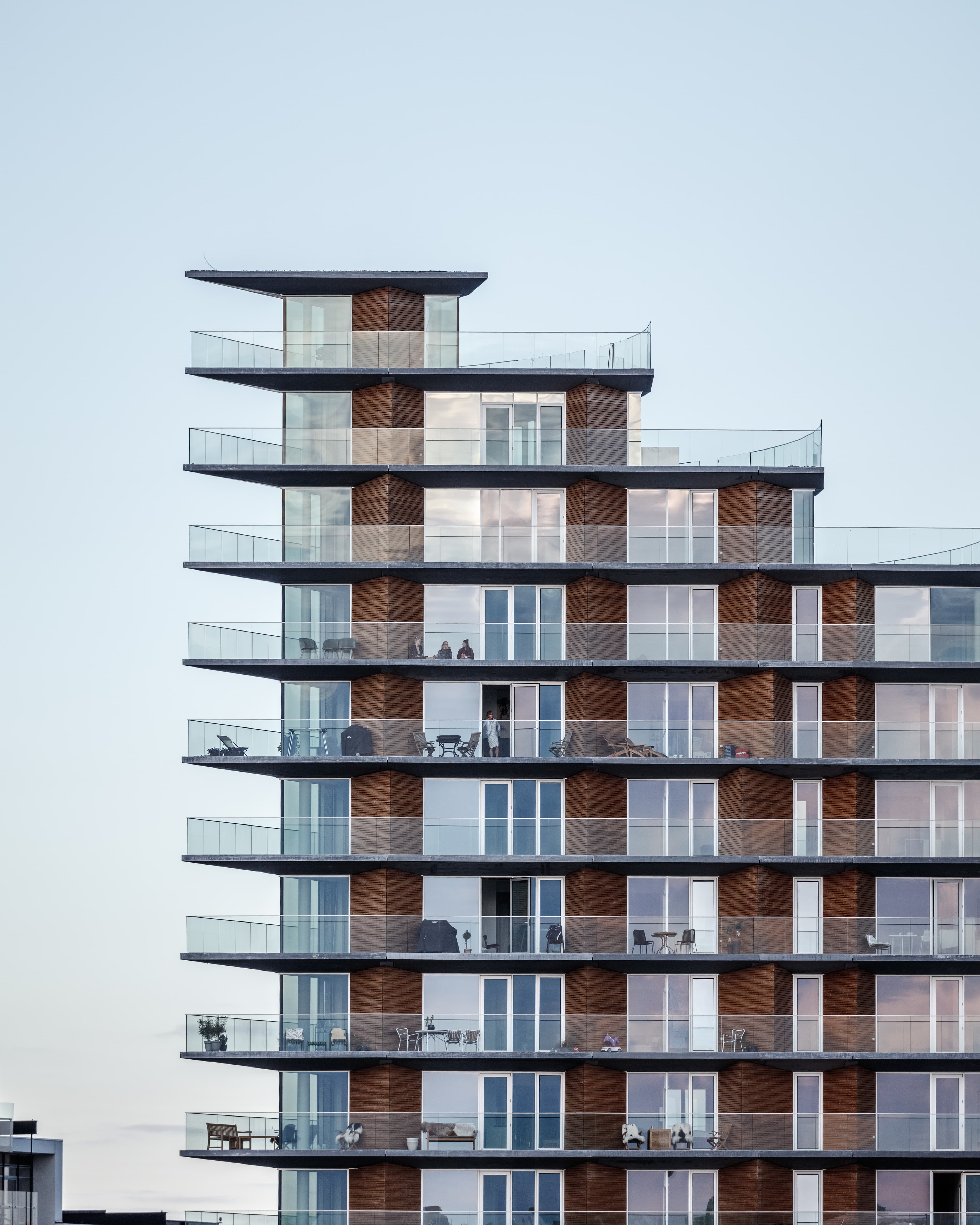 AARhus can be a source of confusion: Are we talking about the city of Aarhus or the landmark residential building on Aarhus Ø? The name is a reference the city’s international airport code, AAR. The design draws inspiration from the city's dominant architectural types: blocks, townhouses, and towers. In AARhus, these elements merge into a cohesive whole. The building is shaped like two large, stepped A’s. From the apartments and terraces, which wrap around the building in long bands of glass, residents enjoy views of the harbor, bay, and city.