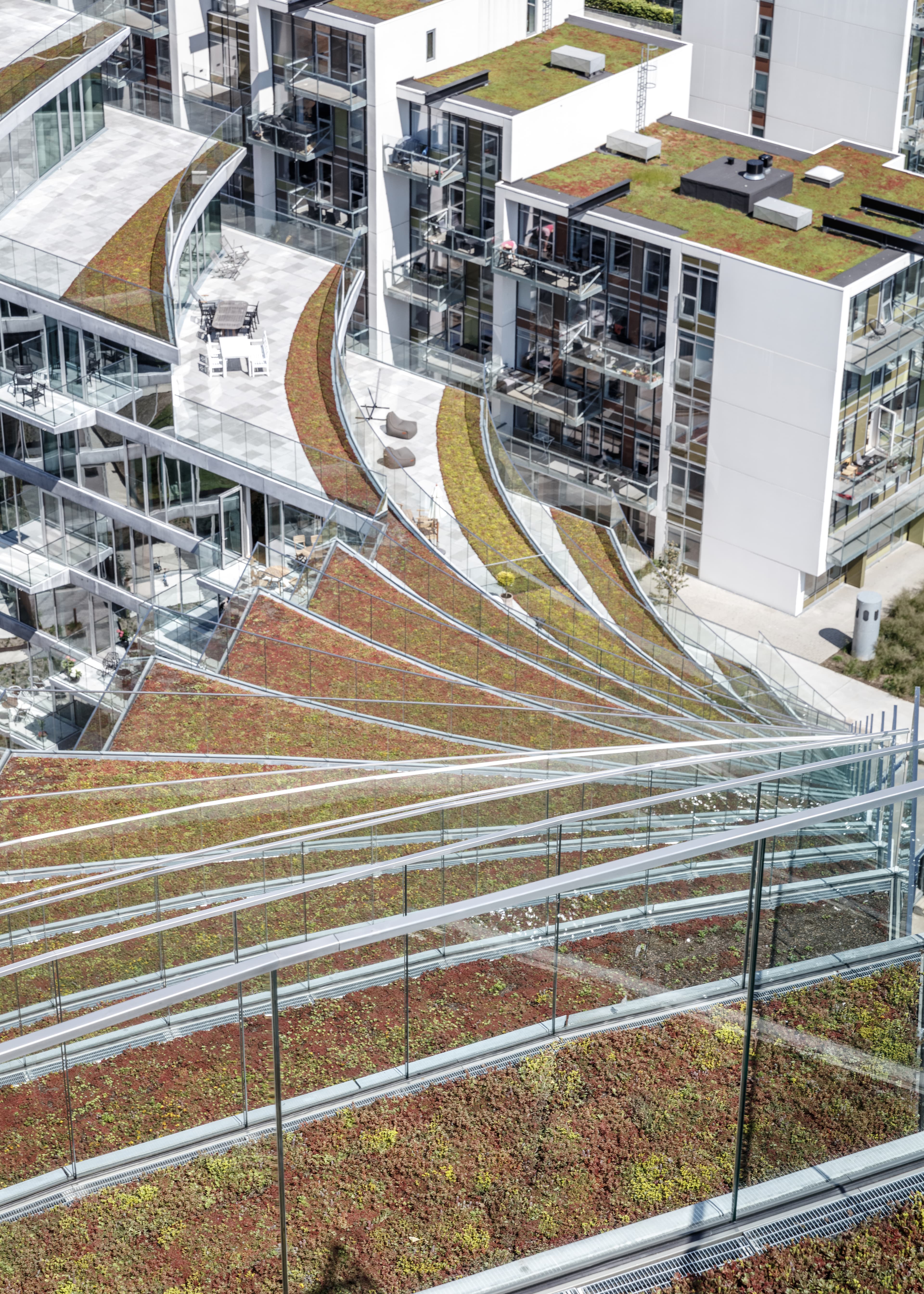 When the weather cooperates, the green courtyard and the staggered rooftop terraces invite residents to outdoor activities at all levels. From here, they can also enjoy the green roofs designed by Nature Impact.