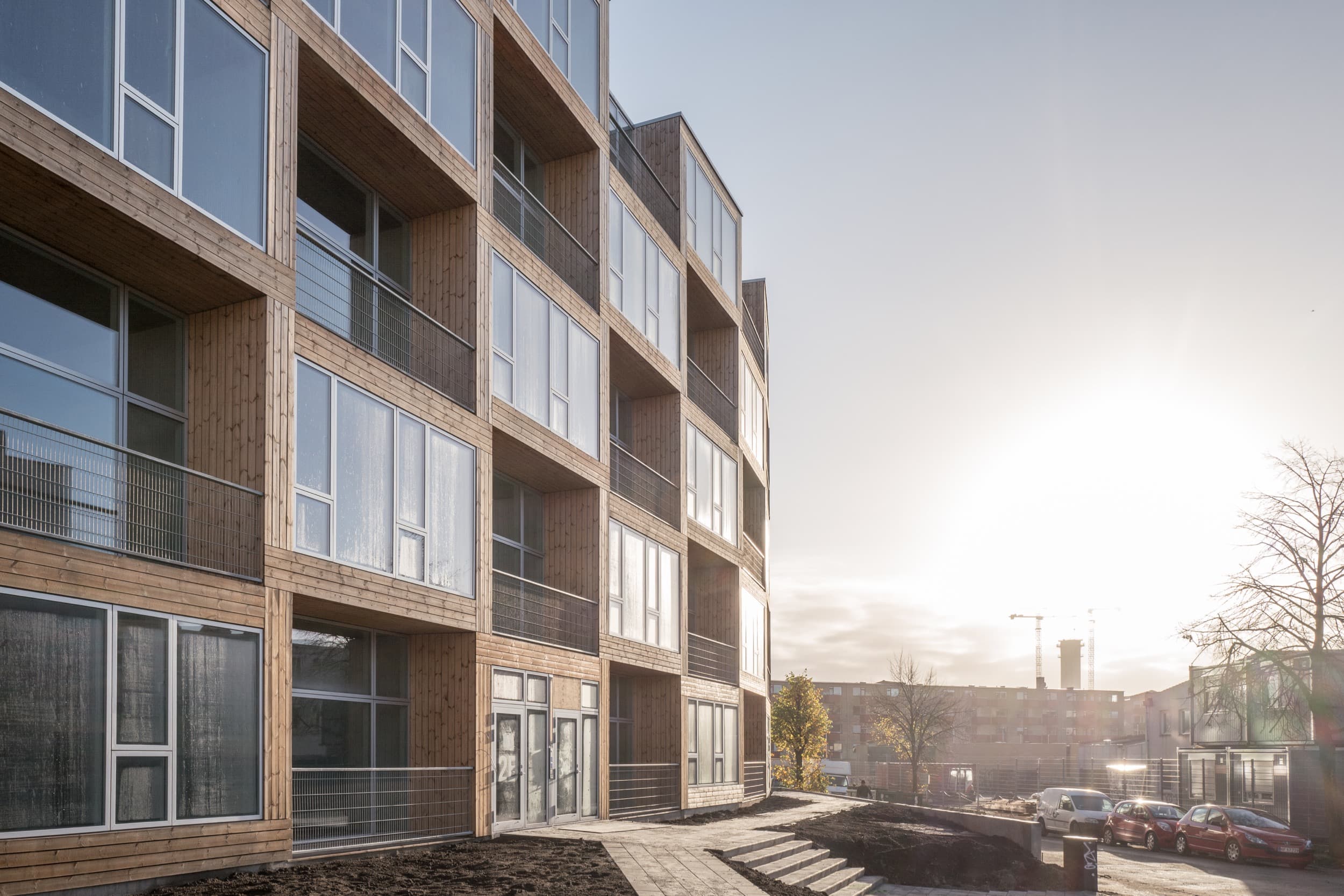 Every other module is set back like a stack of blocks. On the building’s facade, the advantage is obvious. It creates variation and depth, while the wood around the windows creates a distinctive pattern that brings the surfaces to life.