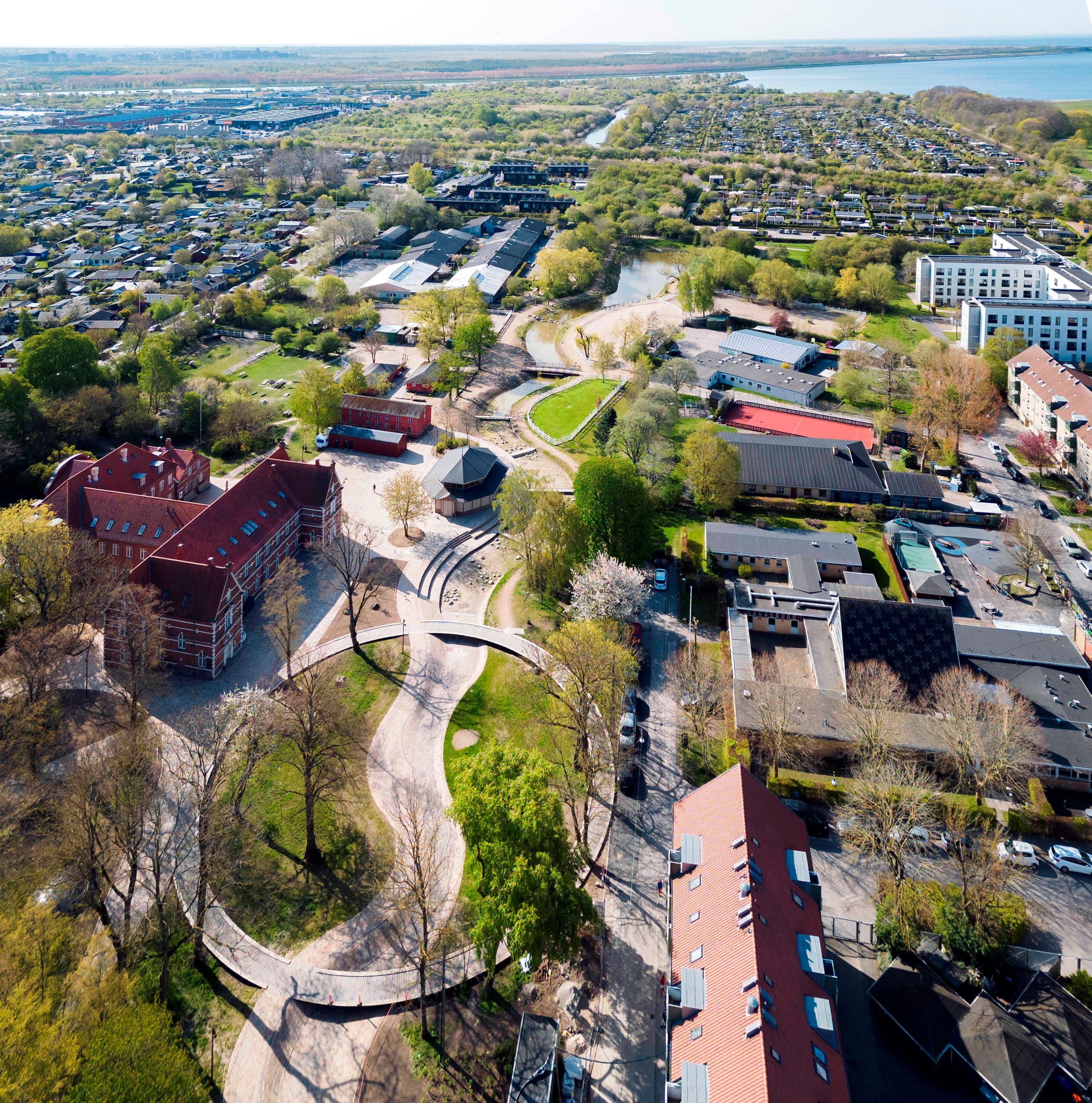 In addition to serving as a new and green urban space, Karens Minde Aksen is also used for passage, storage, and purification of rainwater. Previously, the area had a substantial risk of flooding due to its low elevation, but it is now used for cloudburst protection.
