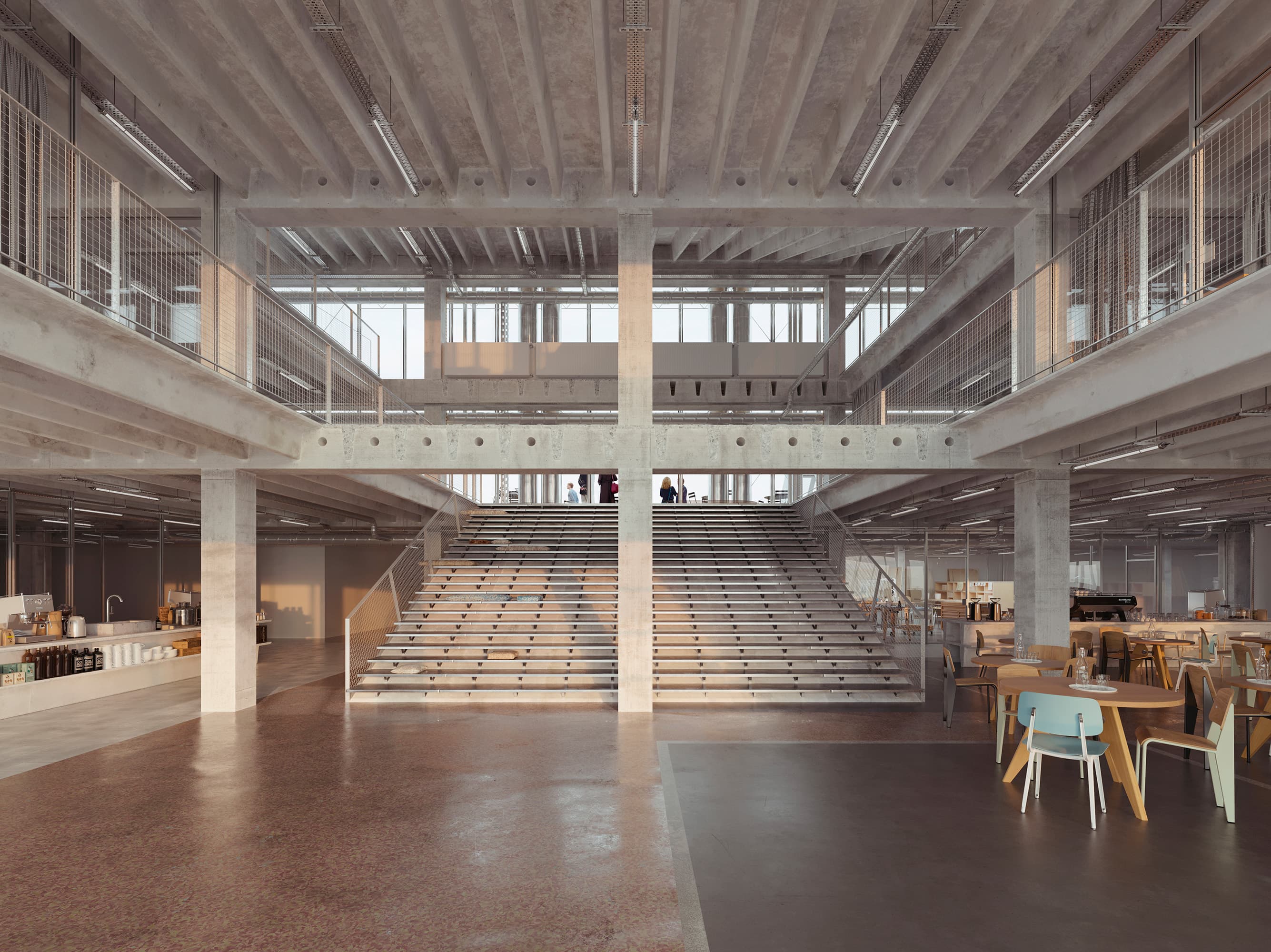Nearly 60 years after its construction, the industrial building has undergone an ambitious and extensive transformation focused on sustainability. Everything that could be reused has been renovated, relocated, or repurposed. Old concrete slabs have been turned into staircases and furniture, while surplus facade bricks now serve as flooring.