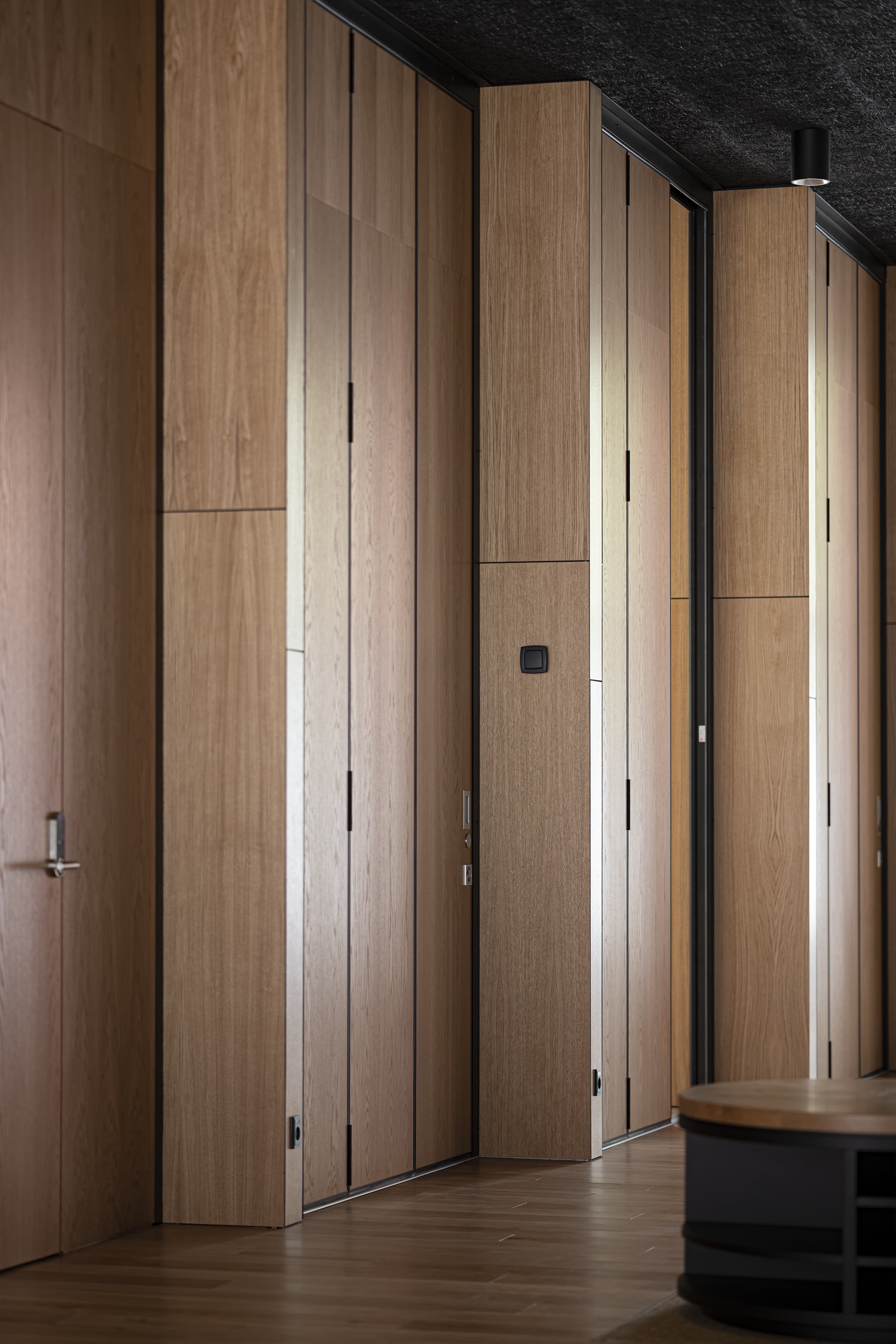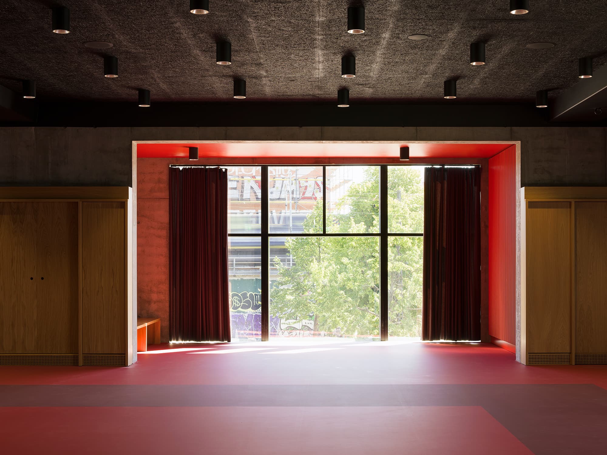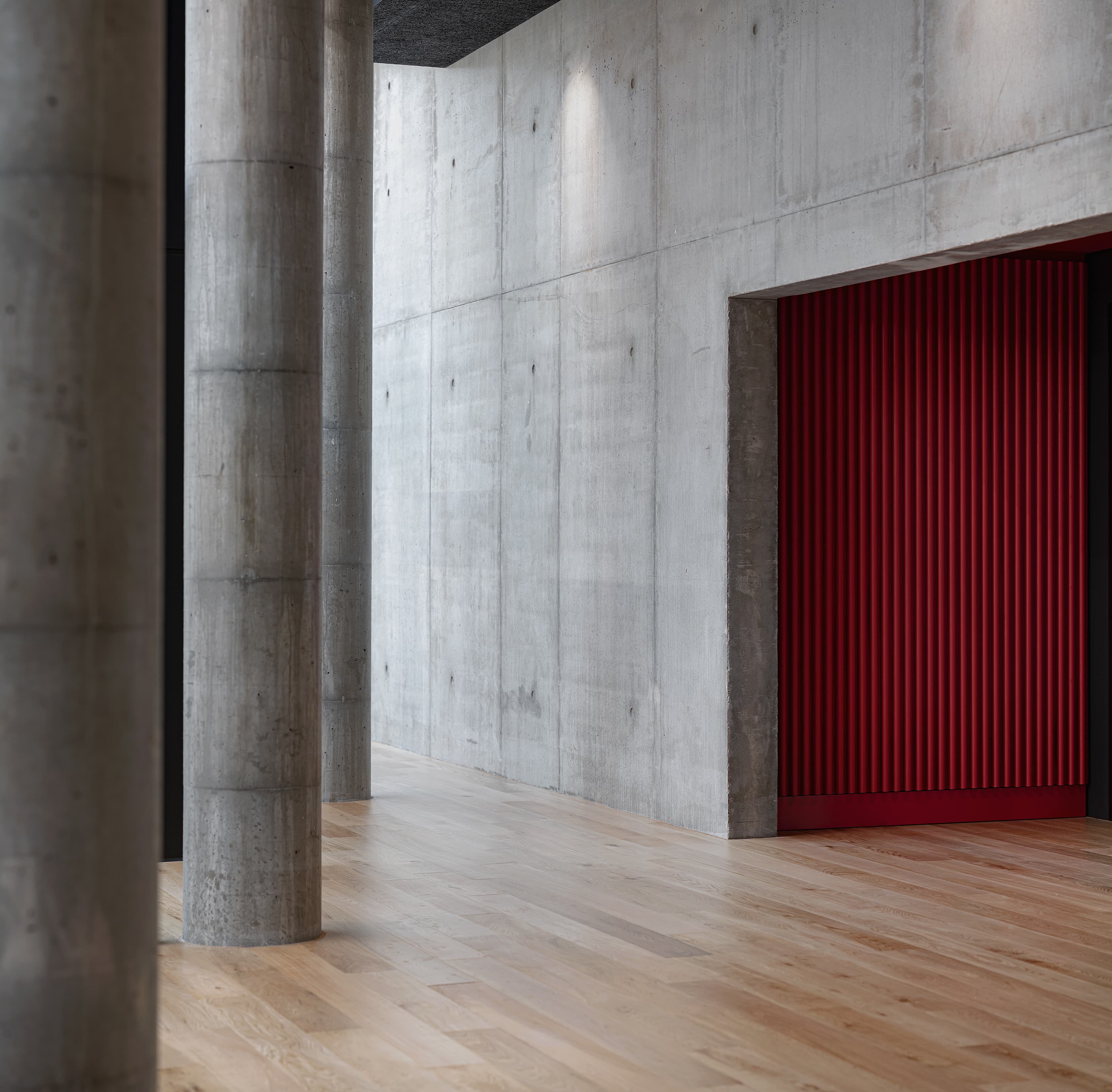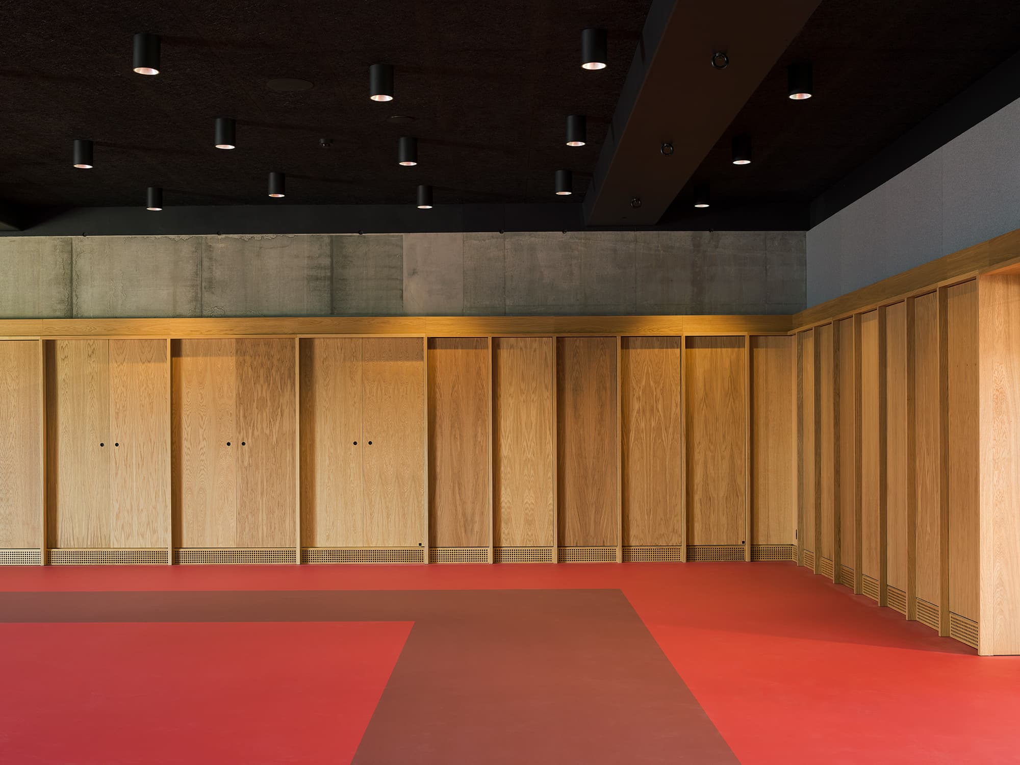 Husets måske stærkeste fortælling finder man i fortolkningen af den koncentration og det nærvær, de asiatiske kampsportsteknikker kræver. Når man træder man indenfor – på strømpesokker, naturligvis – mærker man, at her hænger krop og sind sammen. Bygningens indre er et stilrent univers i beton og træ med høje foldedøre og punktvise detaljer i rødt. Seks kampsale – eller dojos – med indbyggede skabe og udsigt til byen danner ramme om kampsportens træning af styrke, balance og fokus. Pludselig indgydes der til ro midt i den pulserende storby.