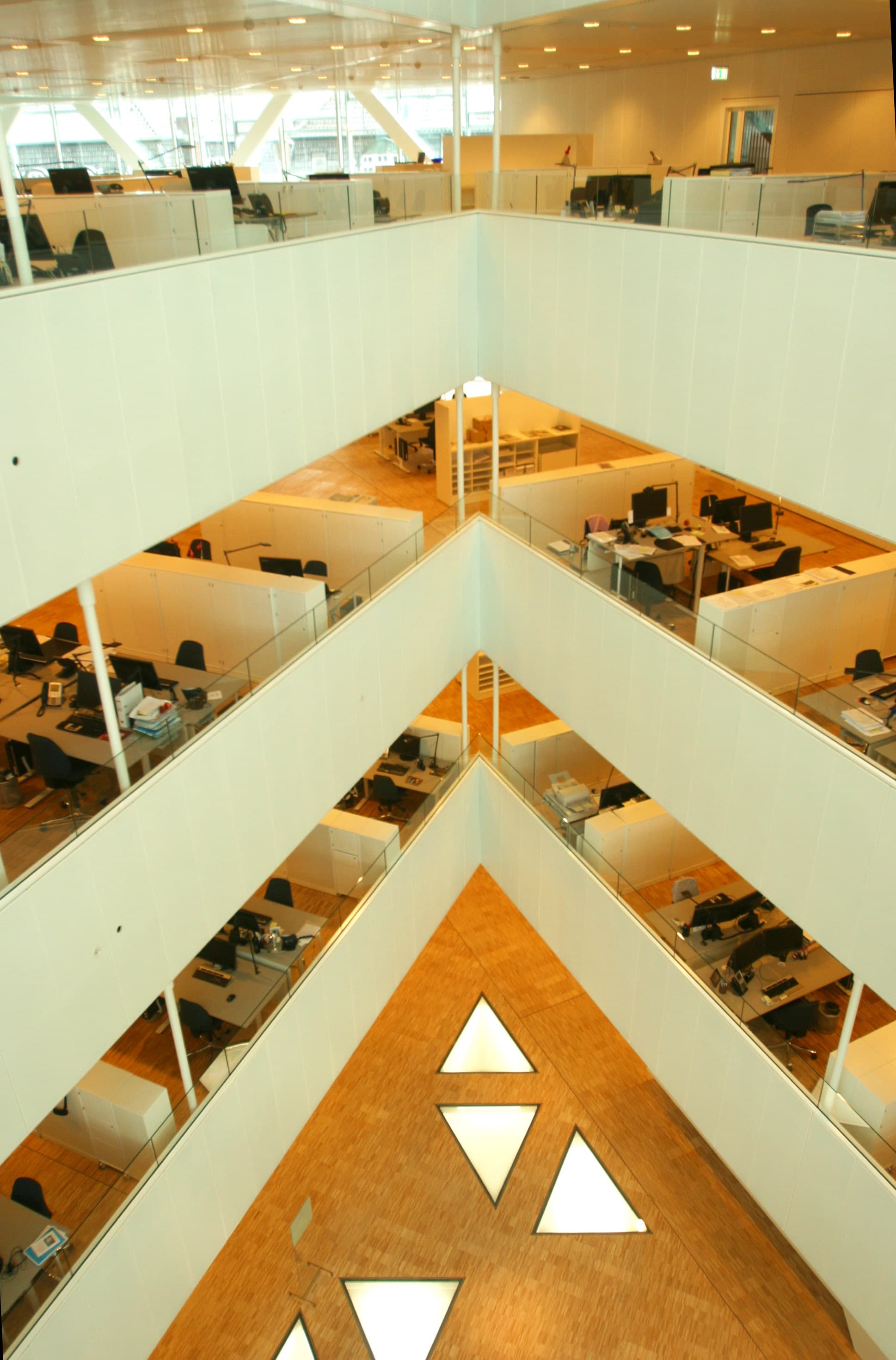 Bygningens indre er betinget af kravet om funktionalitet, fleksibilitet og effektivitet. Etagernes disponering giver mulighed for at indrette enten åbne kontorer, lukkede cellerumskontorer eller mødelokaler. Et rombeformet konstruktivt system placeret umiddelbart inden for facaden bærer bygningen. Bygningsmetoden er blevet valgt af både praktiske og æstetiske grunde, da systemet både fungerer som et arkitektonisk element samtidig med, at det friholder bygningen for søjler.