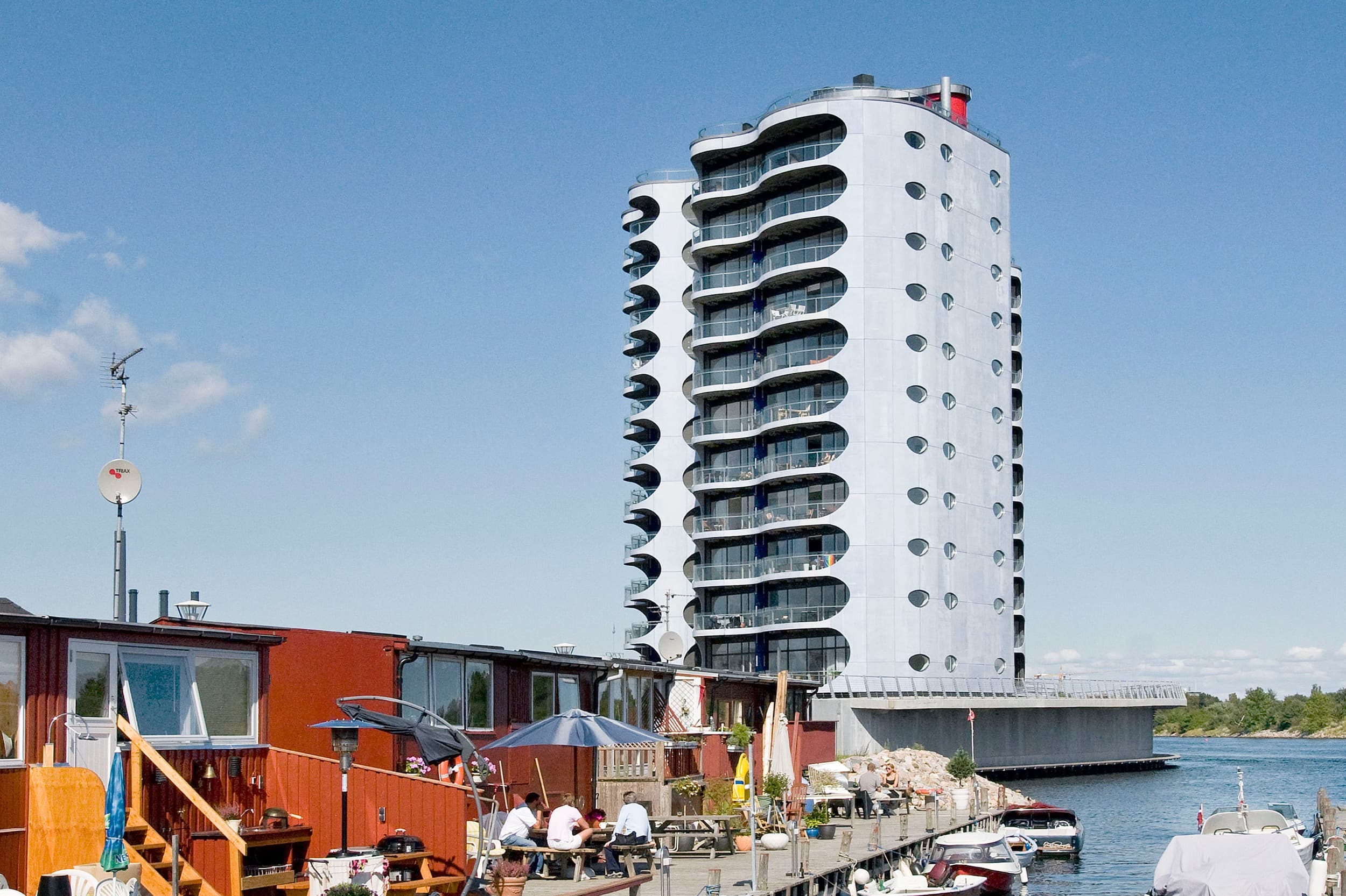 Som et skib, der strækker sig gennem havnens farvande, står det futuristiske Metropolis højt på en fire meter høj kunstig halvø ved kanten af Sluseholmen.