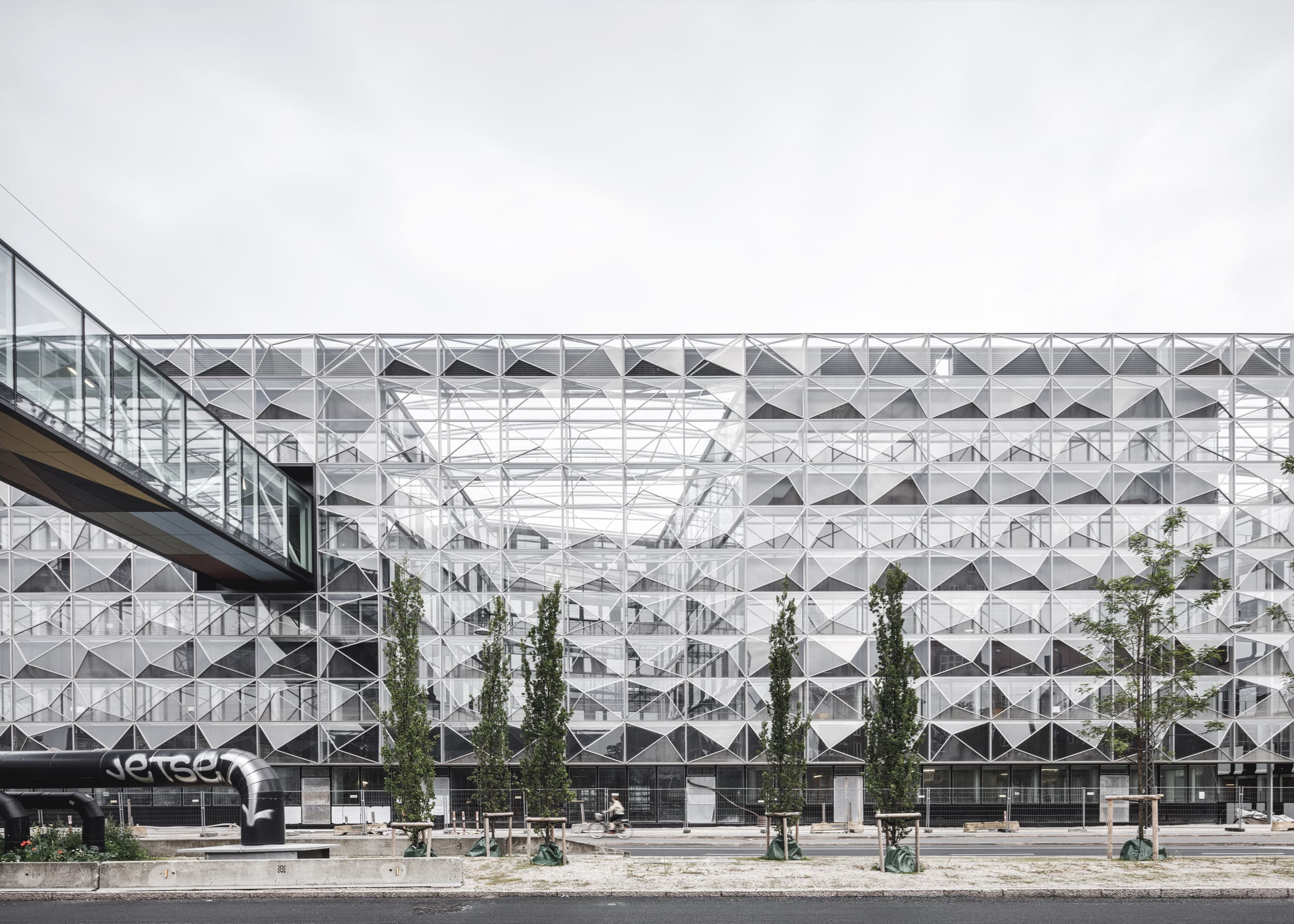 De to bygninger er helt beklædt med pyramideformede glaselementer, der giver spil i facaden, gennemsigtighed og brudte refleksioner. Facademønsteret skal give sammenhæng på tværs af de to bygninger men samtidig sikre et lidt uensartet indtryk.