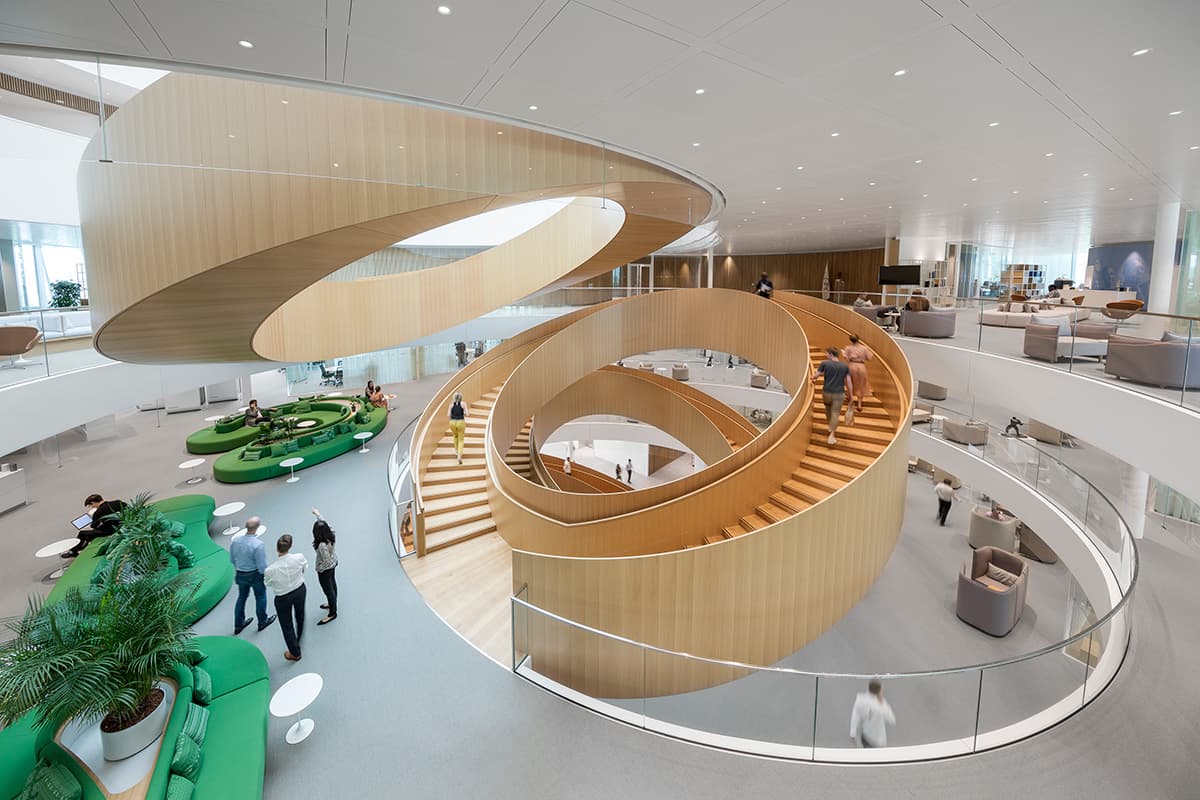 Indenfor er den olympiske ånd også i centrum. Et enormt kunstværk af en trappe binder etagerne sammen i midten af bygningen. 3XN’s karakteristiske trappe i lyst egetræ fremstår som et solidt, organisk modstykke til de mange glasoverflader og hvide vægge. Som fem uafhængige, runde trappeforløb symboliserer den de fem olympiske ringe.