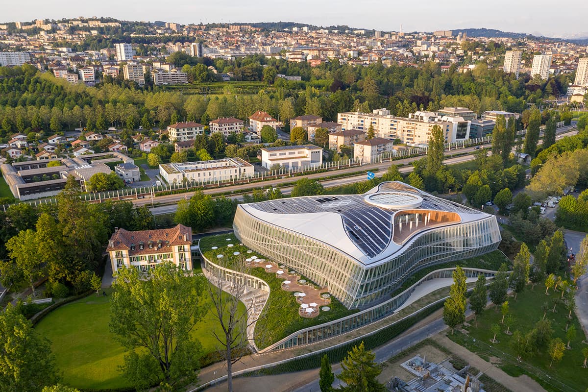 Midt i en offentlig park med udsigt til Genevesøen ligger en bakke med en skæv og dynamisk bygning på toppen. Ved hovedindgangen knejser de olympiske ringe og vidner om, at glasbygningen er hovedsæde for IOC, Den Internationale Olympiske Komité.