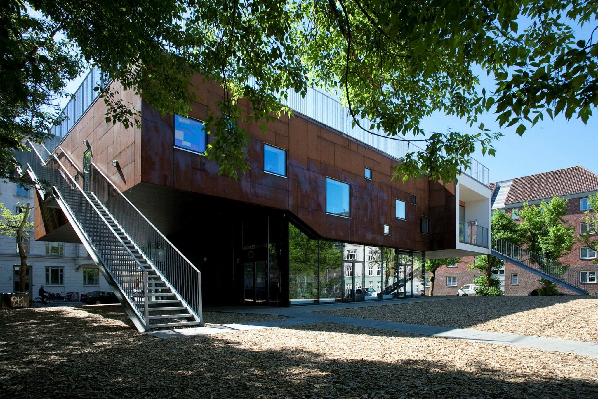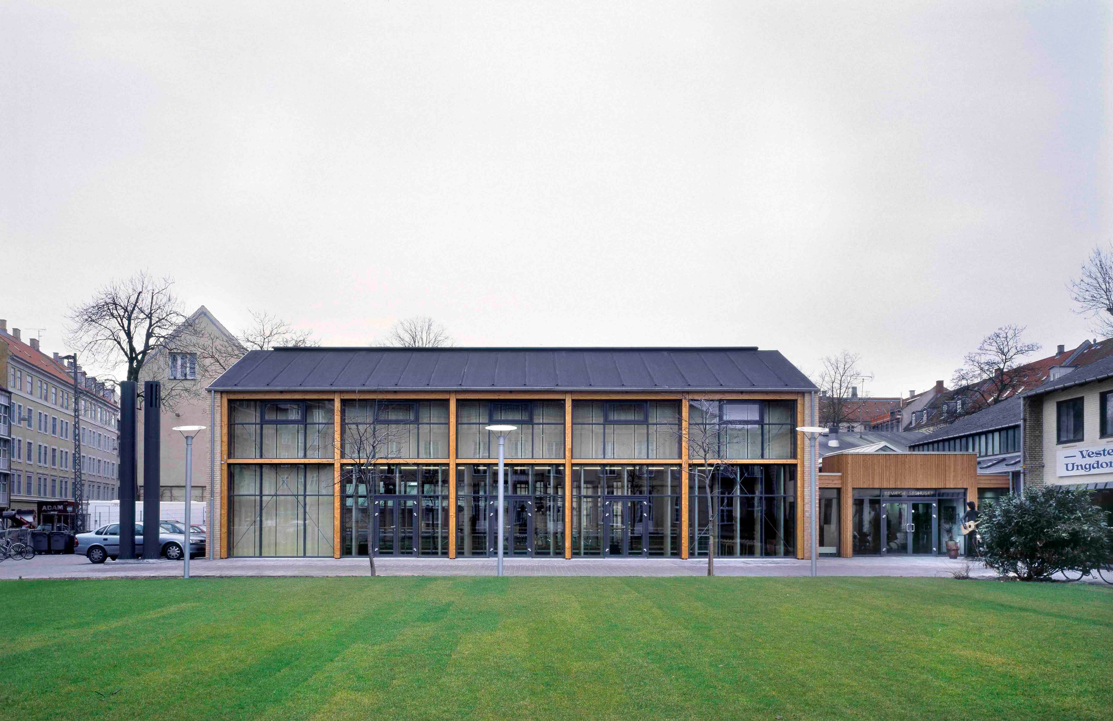 Prismens markante lysegrønne indre får enhver til at standse op. Den store multihal er reelt tænkt som et udendørs rum med overdækning spændt ud over.