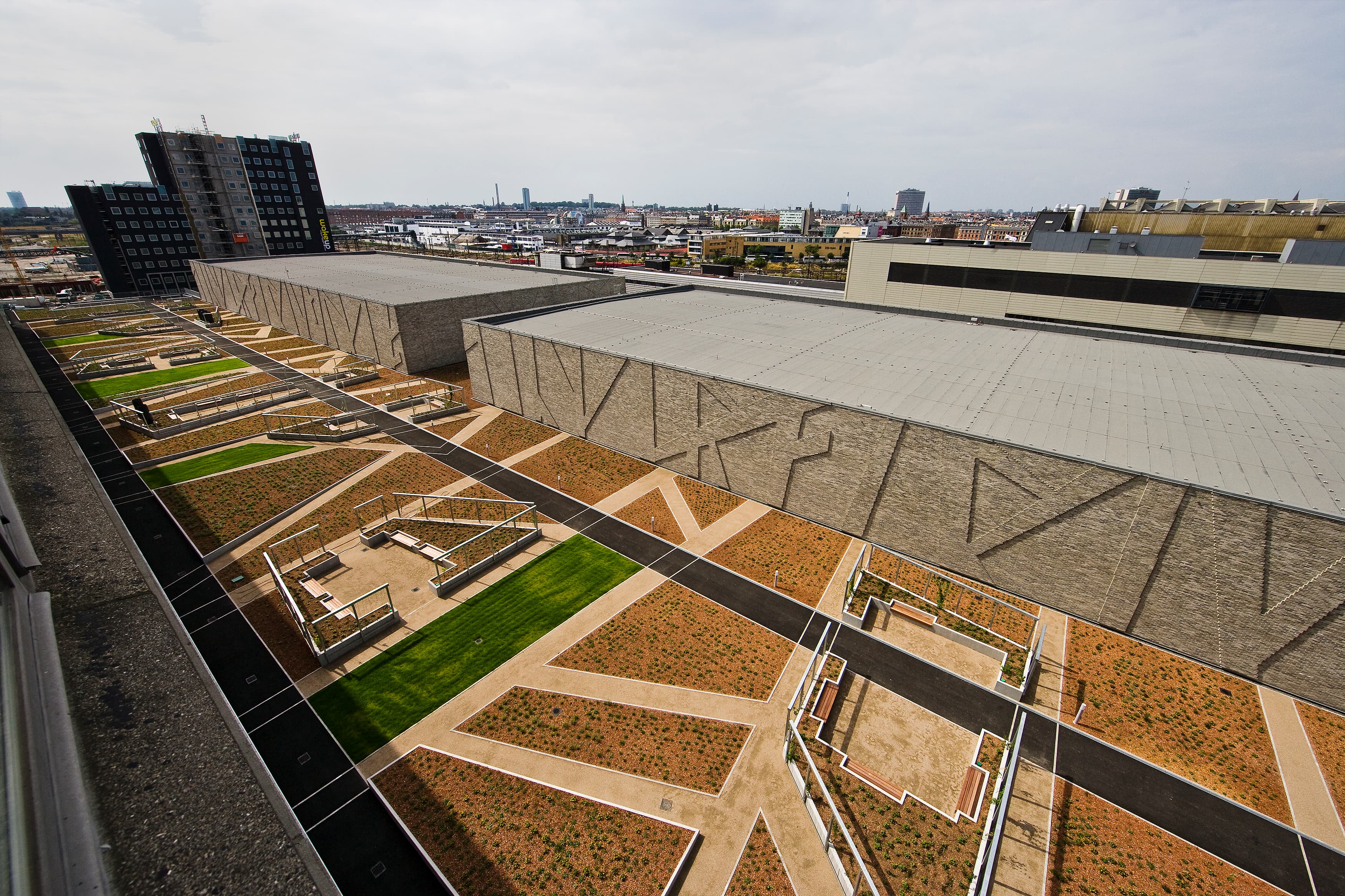 På taget af en af arkivbygningerne, 8 meter over jorden, ligger der et grønt strøg. Her går facadens relieffer igen i form af små stier, som flere steder indrammer mindre opholdsrum med bænke og skrånede bede. På taghaven opsamles regnvand i et reservoir til senere genbrug. Haven er desuden lyd- og varmeisolerende og afgiver en fugtighed, der effektivt regulerer temperaturen i arkivet og sørger for et godt mikroklima.