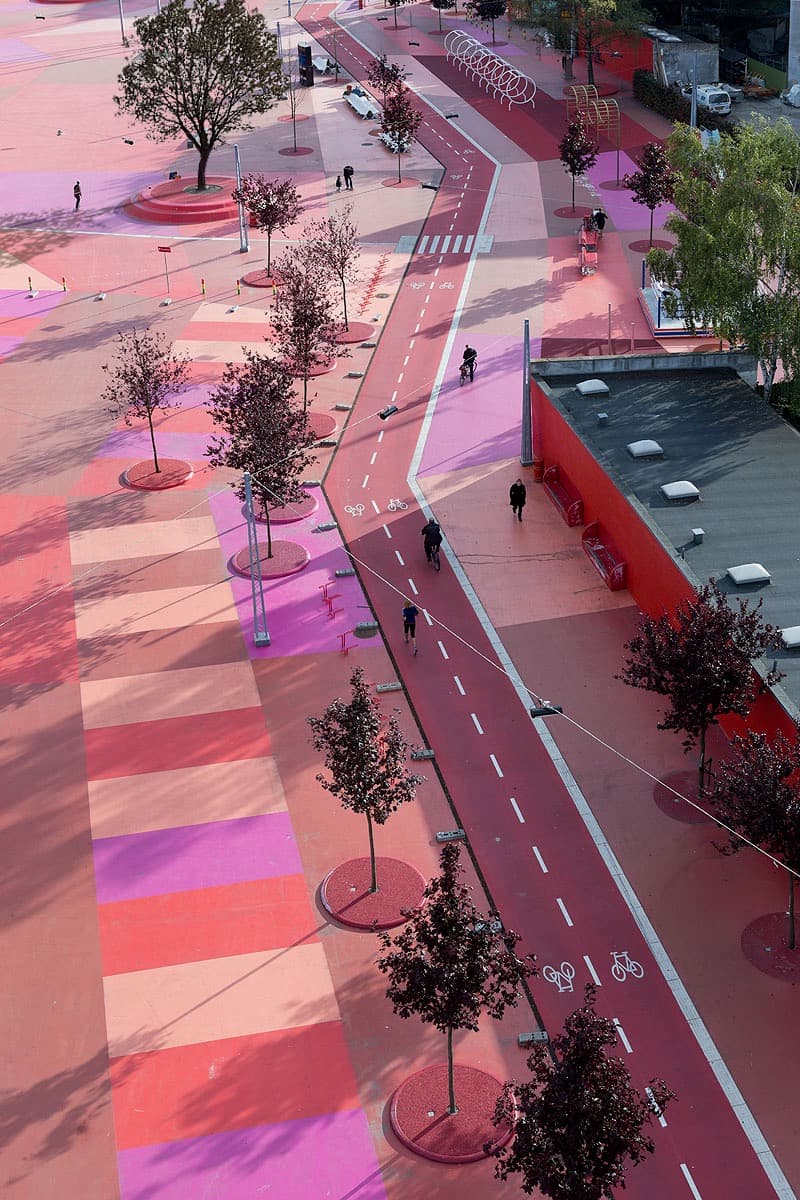 Den Røde Plads præges af russiske og kinesiske neonskilte men også et jamaicansk lydsystem, cirkulære gynger fra Irak og en boksering fra Thailand. Farvenuancer af rød og lyserød spreder sig over by-inventaret og fusionerer omgivelserne uden at skjule mangfoldigheden af møbler og genstande. Alt fra skraldespande til blomstrende træer er en del af det fælles træk, og de forskellige objekter er håndplukket efter direkte ønsker fra brugere og naboer.