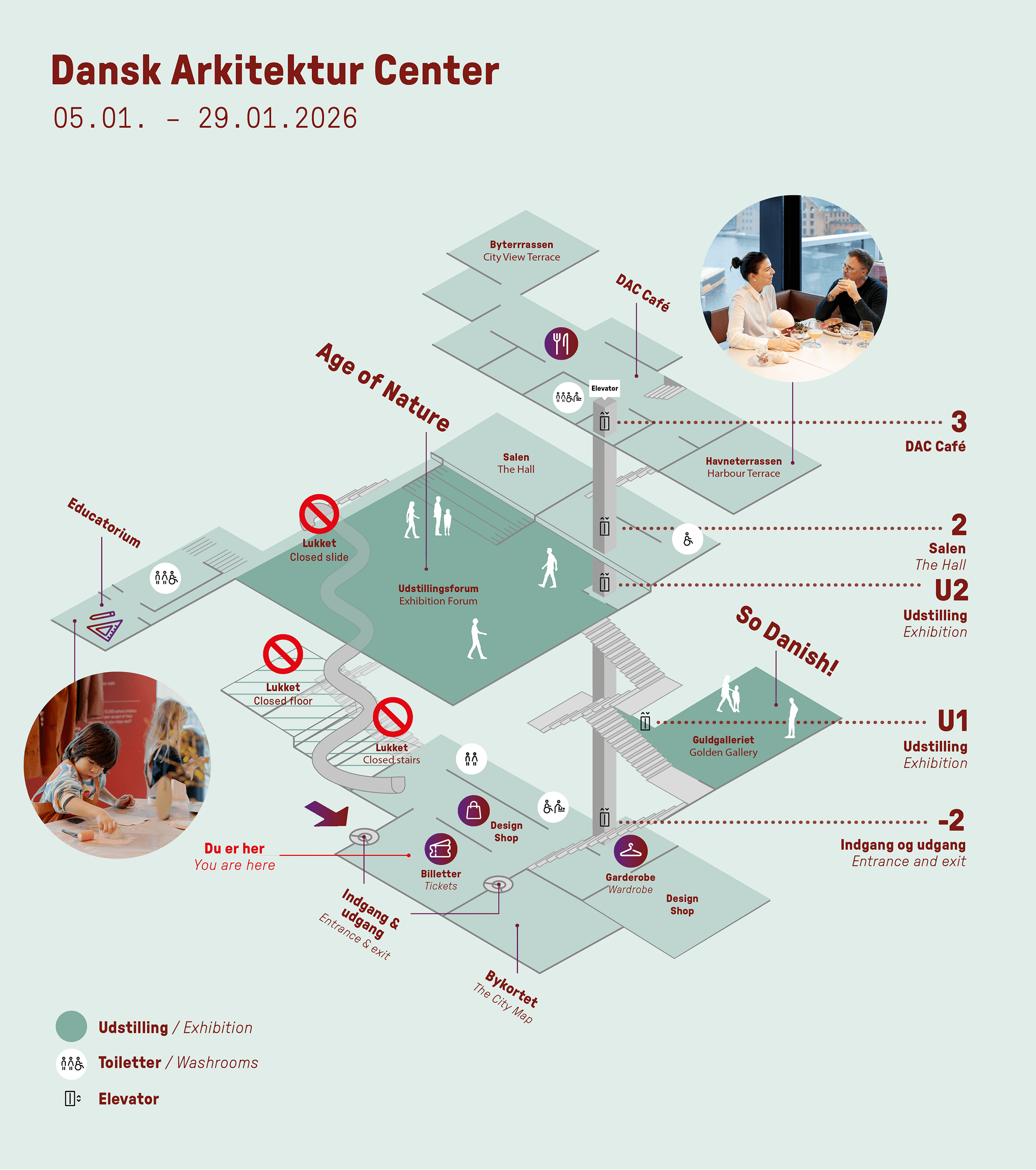Udstillingsområderne i Dansk Arkitektur Center er generelt tilgængelige med elevator, brede gange og siddepladser undervejs. Enkelte installationer og reposniveauer kan være udfordrende for kørestolsbrugere og gangbesværede, men der tilbydes hjælpemidler og tydelig formidling på både dansk og engelsk.