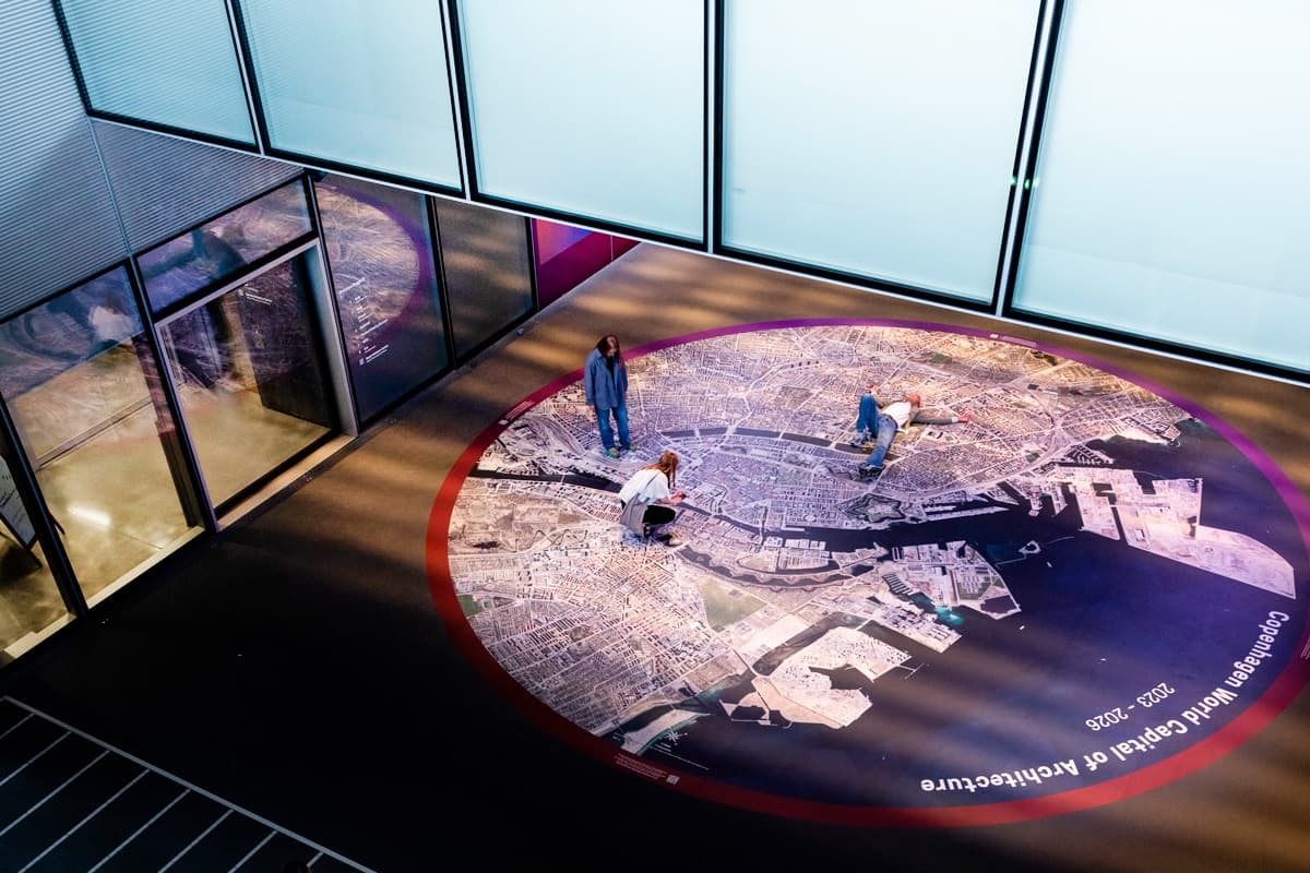 Start din udforskning af Københavns arkitektur på gulvet lige under BLOX. Her kan du gå rundt på et gigantisk luftfoto af byen og få det totale overblik.
