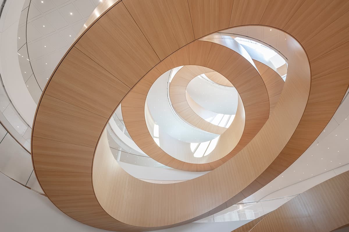 Udefra fremstår Olympic House i Schweiz næsten helt gennemsigtig, og indenfor svinger en trappe af olympiske ringe sig op mod taget som et enormt kunstværk, der binder etagerne sammen i midten af bygningen.
