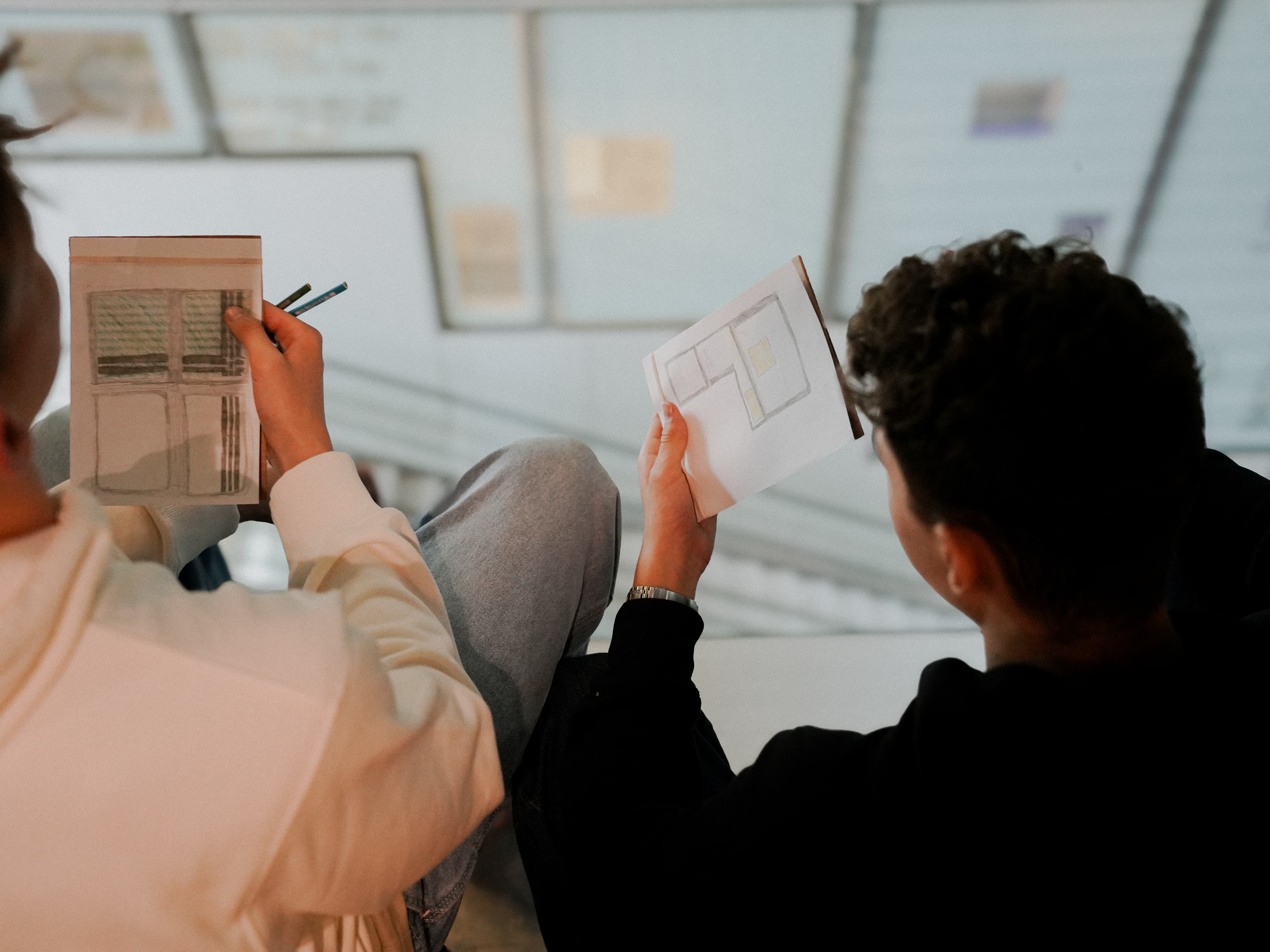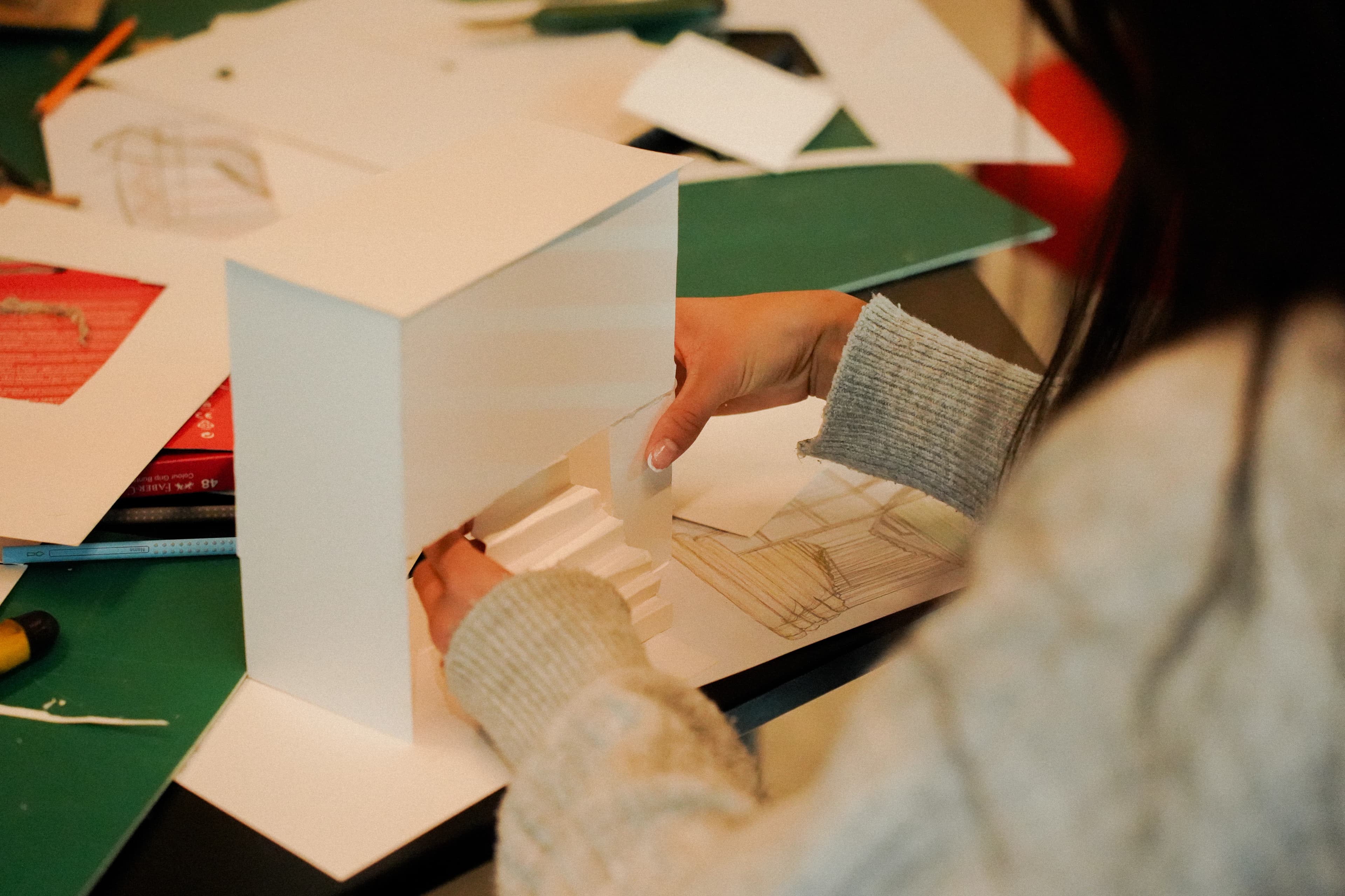 Tegninger og modeller samles løbende i et fælles værk. Her vokser et samlet billede frem af arkitekturen – formet af elevernes blikke, hænder og valg undervejs.