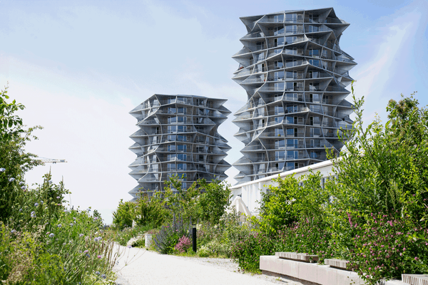De runde tårne i den nye ’Postbyen’ opføres langs sporene ved Hovedbanegården og markerer også starten af ’Kalvebod Highline’ - et nyt grønt strøg i byen, hvor det snart bliver muligt at spadsere hele vejen fra Bernstorffsgade og videre til Dybbølsbro, højt hævet over trafikken fra indfaldsvejen.