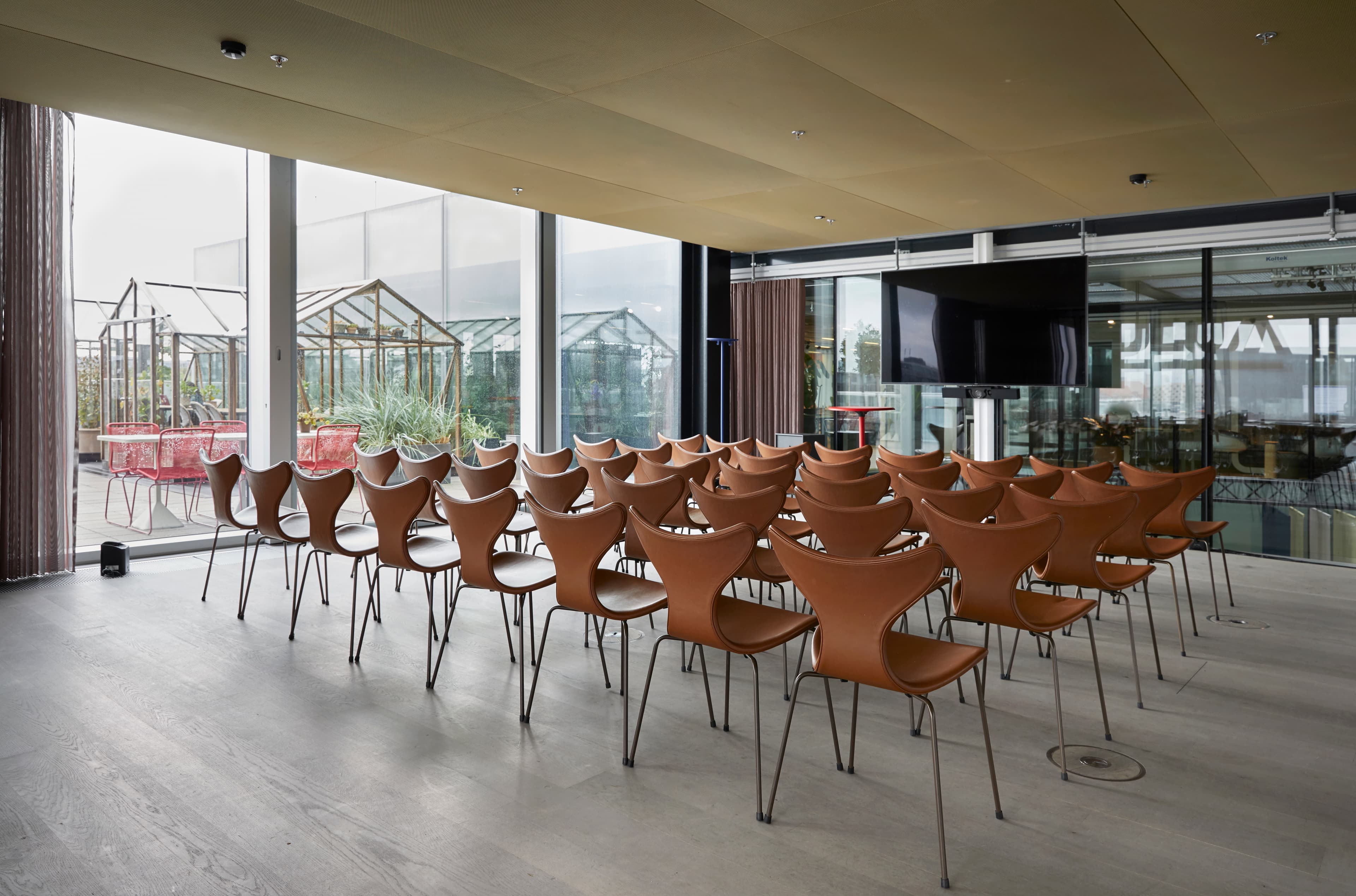 Vores møderum panorerer flot på toppen af BLOX. Her har du enten udsigt over byen eller ind til udstillingerne og de kreative kontorer i bygningen.