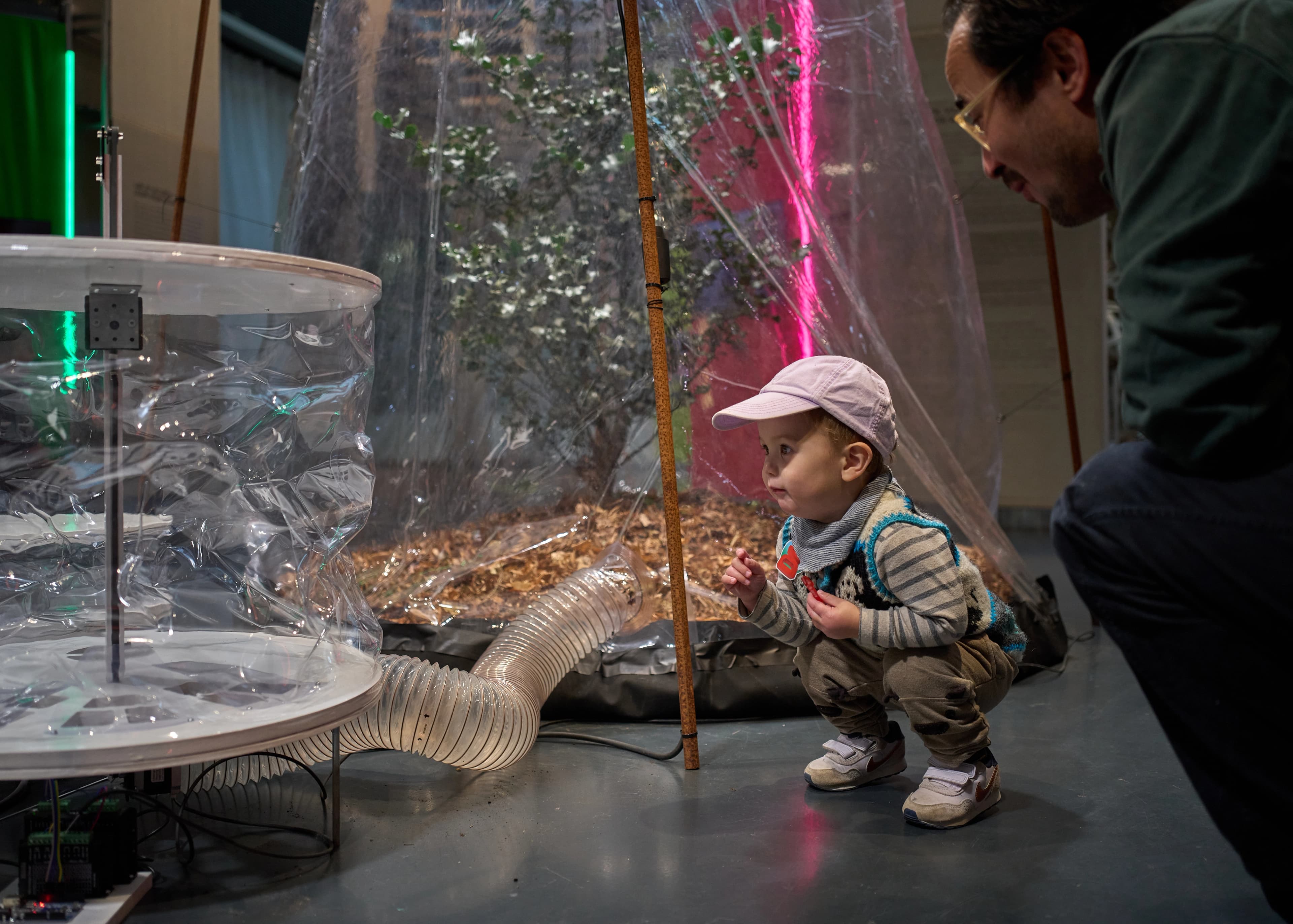 In the exhibition, you encounter Lung Trees, an installation by Danish artist Rune Bosse. Here, living trees are wrapped in plastic, sustained by UV lights and machines, to keep them alive.