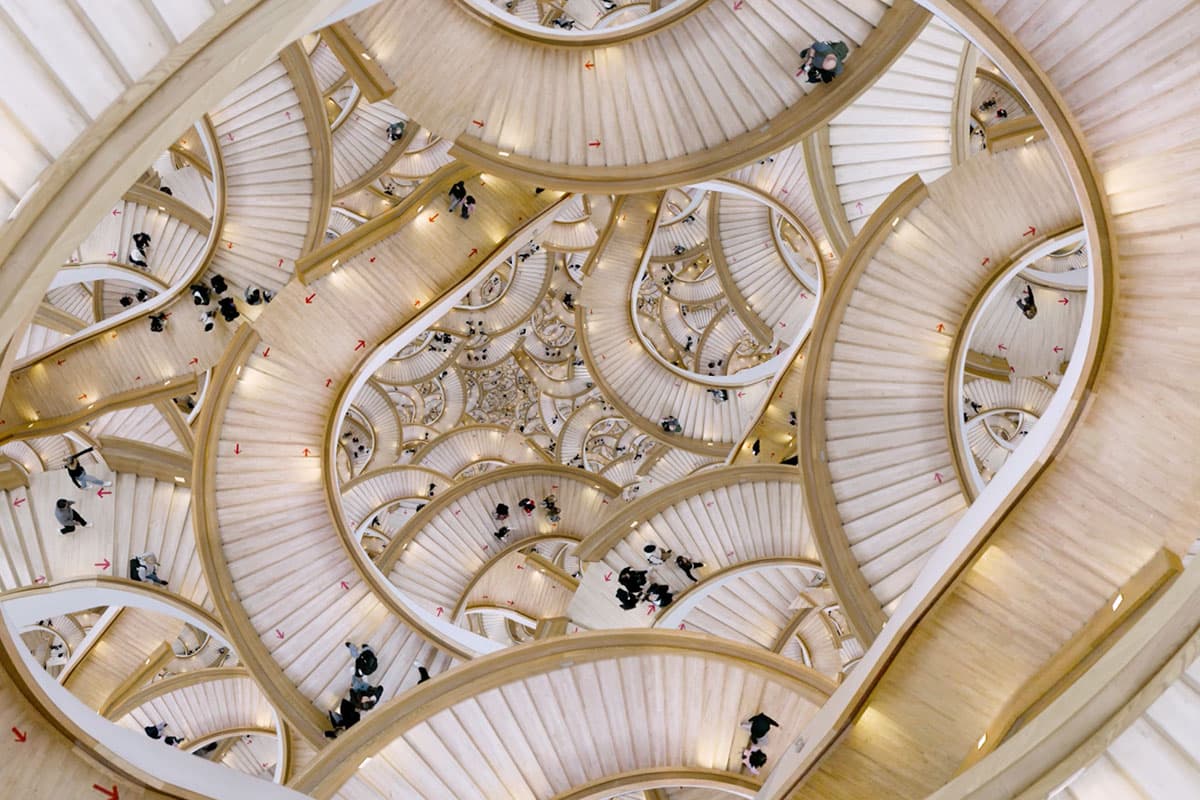From the outside, the Olympic House in Switzerland appears almost entirely transparent, and inside, a staircase of Olympic rings winds up towards the roof like a massive piece of art, connecting the floors in the center of the building.
