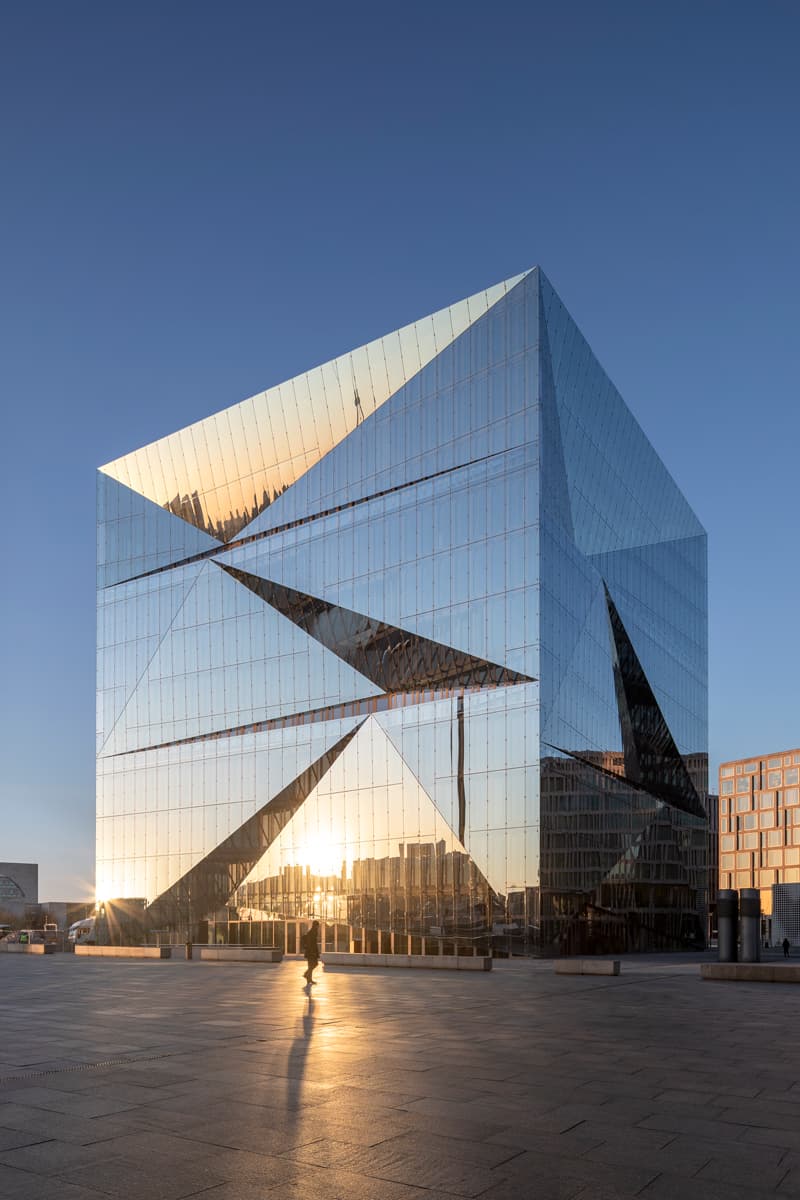 In Berlin, 3XN has created Cube Berlin, an office building that echoes its surroundings in prism-shaped patterns, offering passersby a transformed mirrored image of themselves and the life around them. Data on users’ behavior is continuously used to optimize indoor climate and energy consumption.