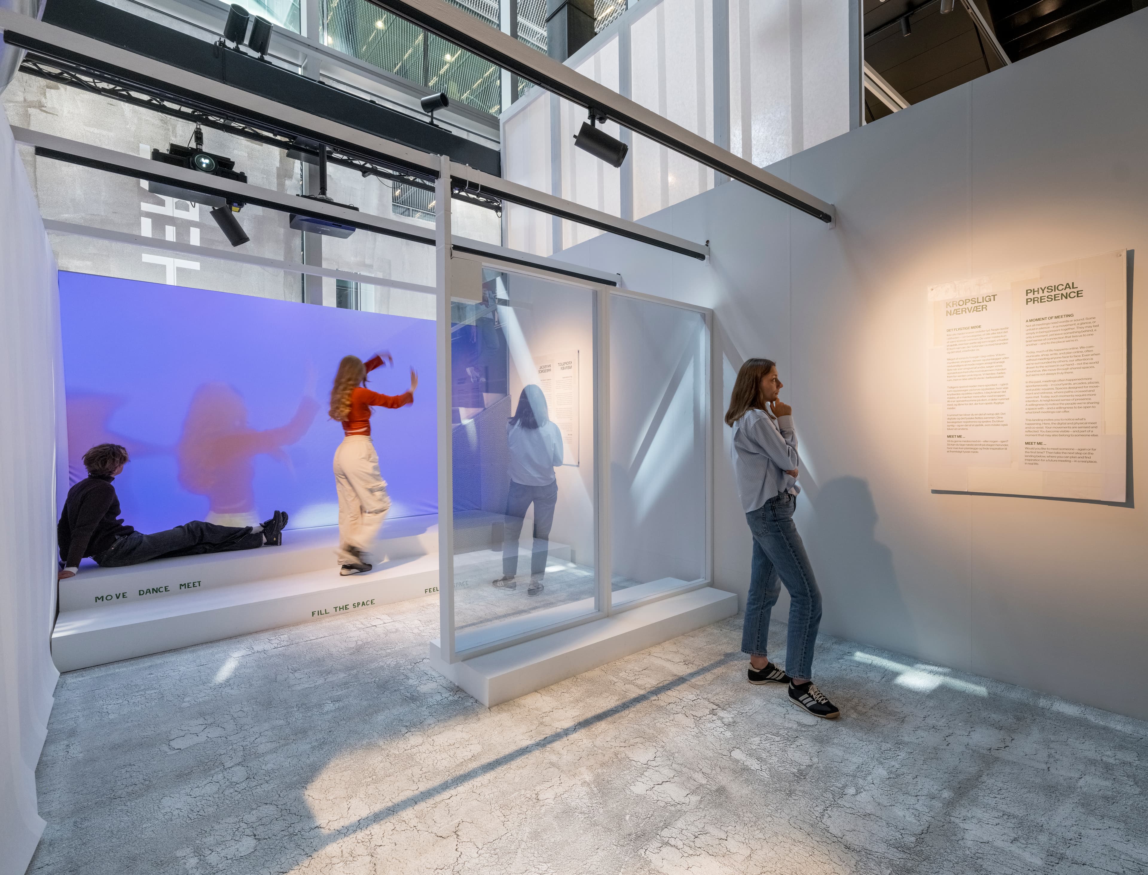 The top landing can only be accessed via stairs or escalator. The lift does not serve the top landing due to technical limitations. This is where the introductory text to the exhibition is located, along with the Photo Booth, where visitors can take a free photo. The Photo Booth is lit with extra-bright light to ensure photo quality, which may be disturbing for light-sensitive visitors.The second landing, titled A Little Hello, has a bench in the center of the room, which may limit mobility for wheelchair users. Both light and sound are used on this landing, which may be overstimulating for guests sensitive to sensory input. The third landing, A Trace in the Space, is spacious and accessible for wheelchair users. Two video pieces are shown here featuring bright light and white noise, which may be uncomfortable for some visitors.The fourth landing, Physical Presence, is also accessible for wheelchair users. A video installation with strong, moving light is displayed here, which may affect guests who are sensitive to light. As in the rest of the exhibition, texts are available in Danish and English, but not in Braille.