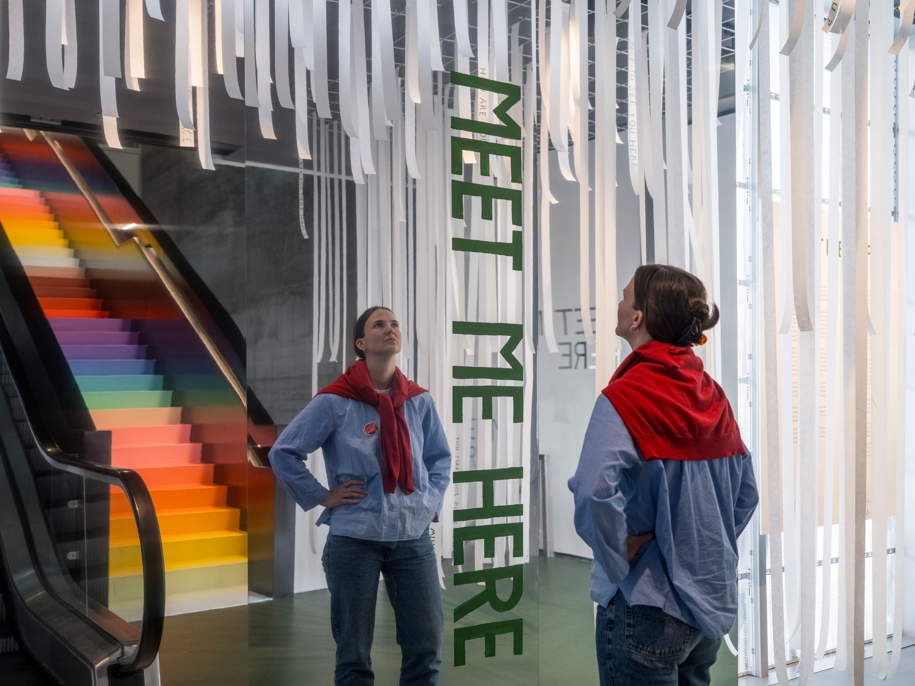 The exhibition Meet Me Here is a smaller exhibition shown in the Stair Gallery, a five-landing exhibition space. The exhibition begins on the top landing, which can be accessed via the escalator or the Rainbow Stairs from Forum. We recommend starting your visit here, but the exhibition can also be accessed through the DAC Design Shop. There is no elevator to the starting point of the exhibition. Three of the four landings can be accessed via a lift from the DAC Design Shop, but the lift only goes to the landing called A Little Hello, meaning the upper part of the exhibition – including the Photo Booth – is not accessible. The lift measures 100 cm x 77 cm. If your wheelchair does not fit, DAC offers a loaner wheelchair. This also applies to guests with limited mobility. To reserve a wheelchair, please contact welcome@dac.dk no later than 12:00 the day before your visit. All landings are carpeted, which may make navigation difficult with a wheelchair or stroller. Spotlights are used in several areas, which may be challenging for light-sensitive visitors. The landings do not feature guiding lines. Exhibition texts are available in both Danish and English. Braille is not available.
