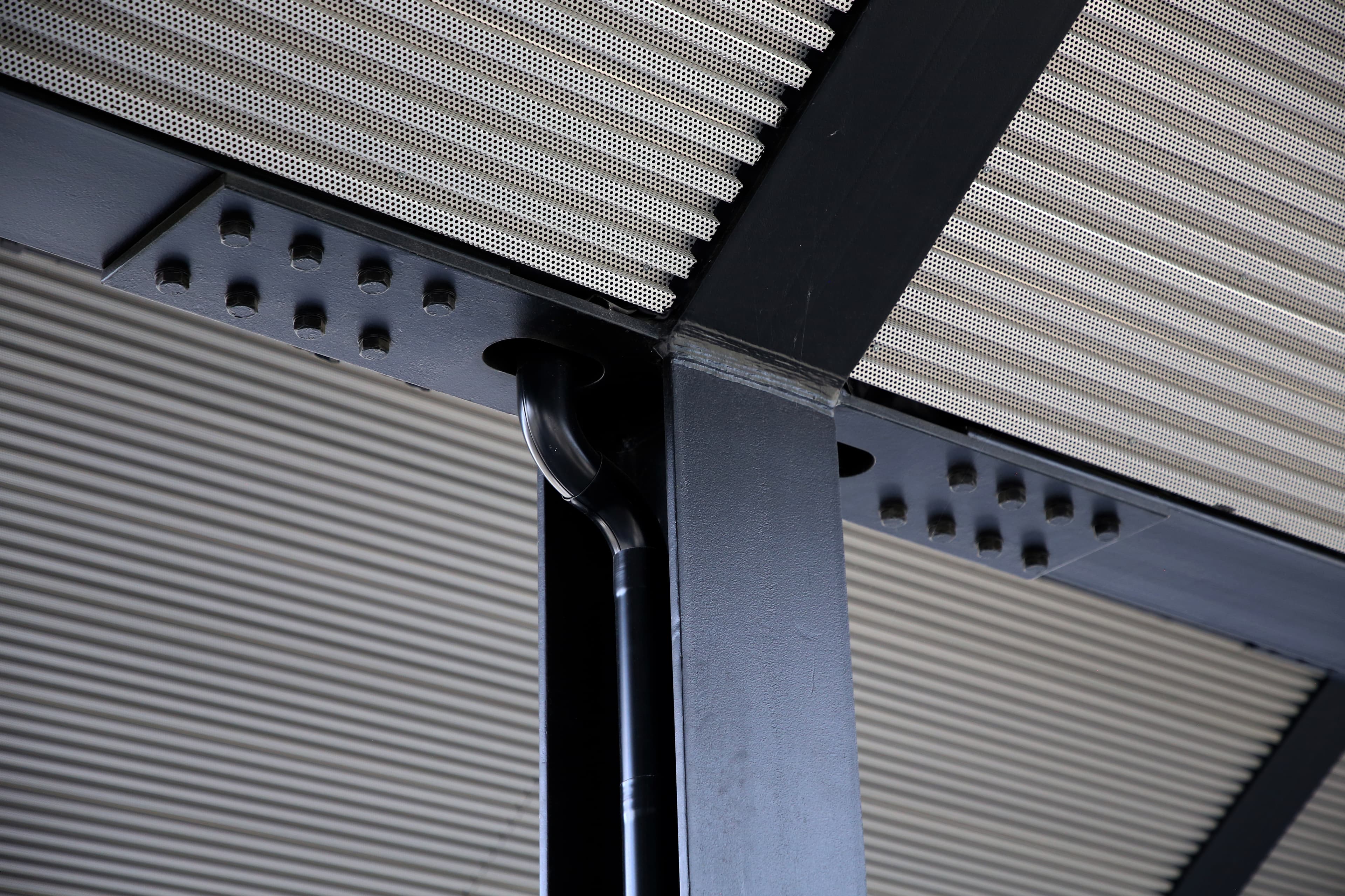 The underside of the terminal’s composite gable roof is covered with a perforated, slatted material that helps dampen noise. Beyond that, there are few special details or decorations. The focus is on function and practicality.