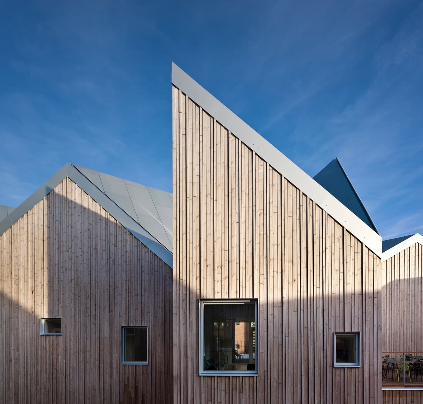 The centre is an anomaly in its Nørrebro neighbourhood of red brick residential blocks – both for its light-refracting aluminium façades, and as a cluster of individual houses connected by a sculptural roof.