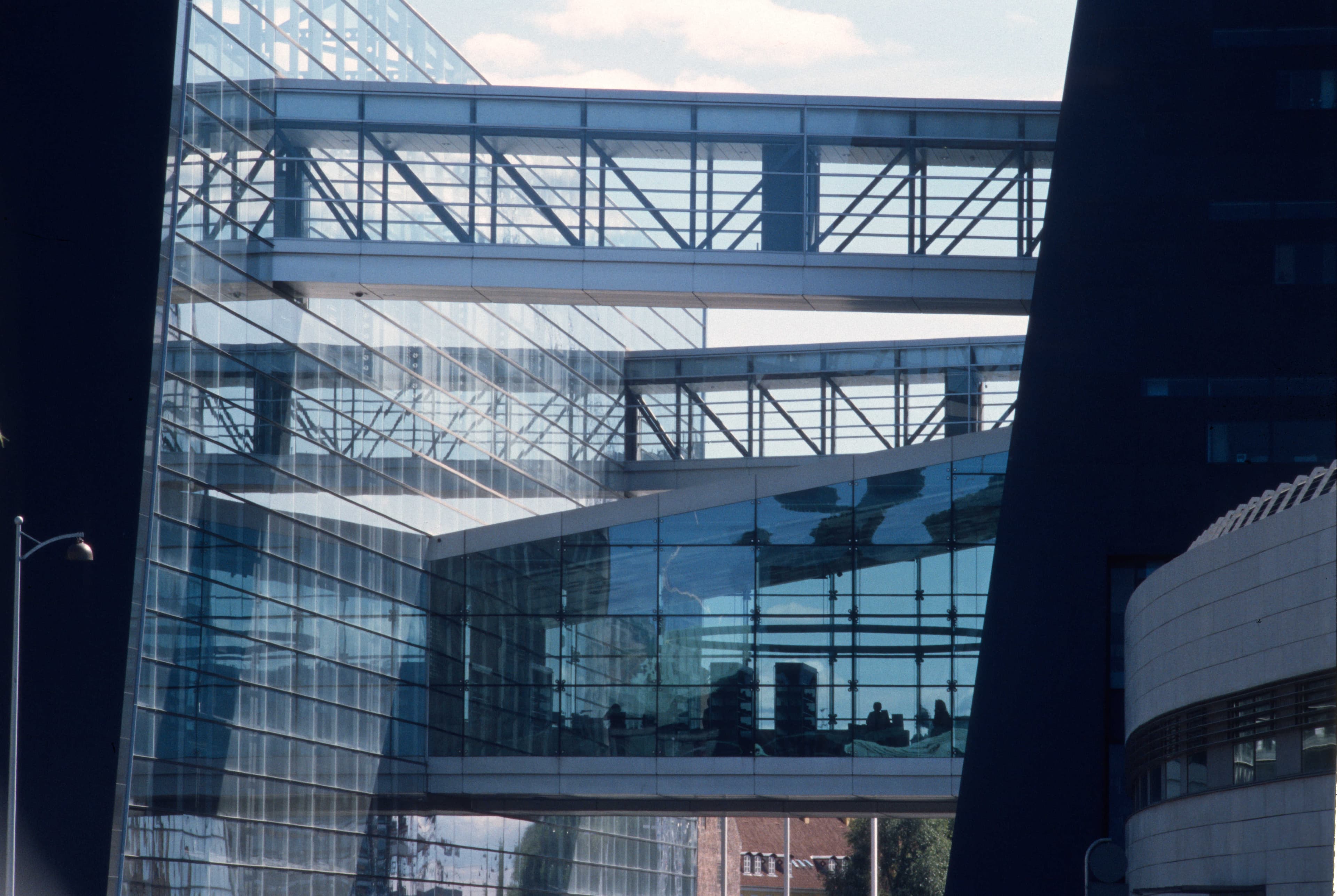 The slanting pre-stressed glass facade comprises a system of pressure rods and cables in a vertical system with a load of 10 tons. The top of the structure is held up by giant steel girders, weighing 1 ton per meter and secured at the base of the structure to L-beams turned on their head to resemble the number 7. Both the girders and beams are made from Polish steel. With this construction, it is possible to have the slanting facade without too many disrupting components.