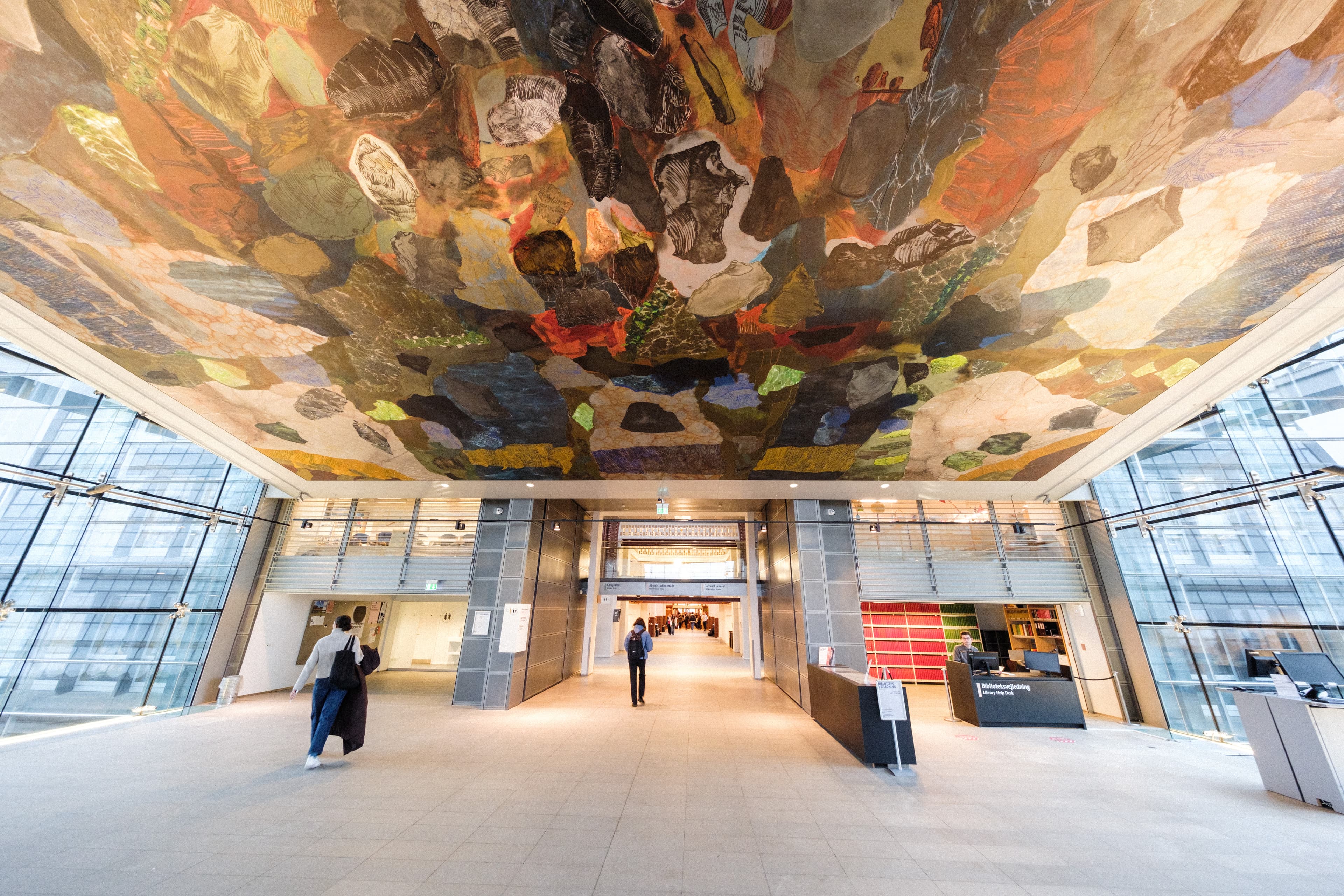 The Black Diamond offers a range of exciting artworks, including the Kirkeby Bridge named after the renowned Danish artist, Per Kirkeby. His impressive decorations adorn the entire ceiling of the bridge, connecting the Black Diamond with the library's older buildings.