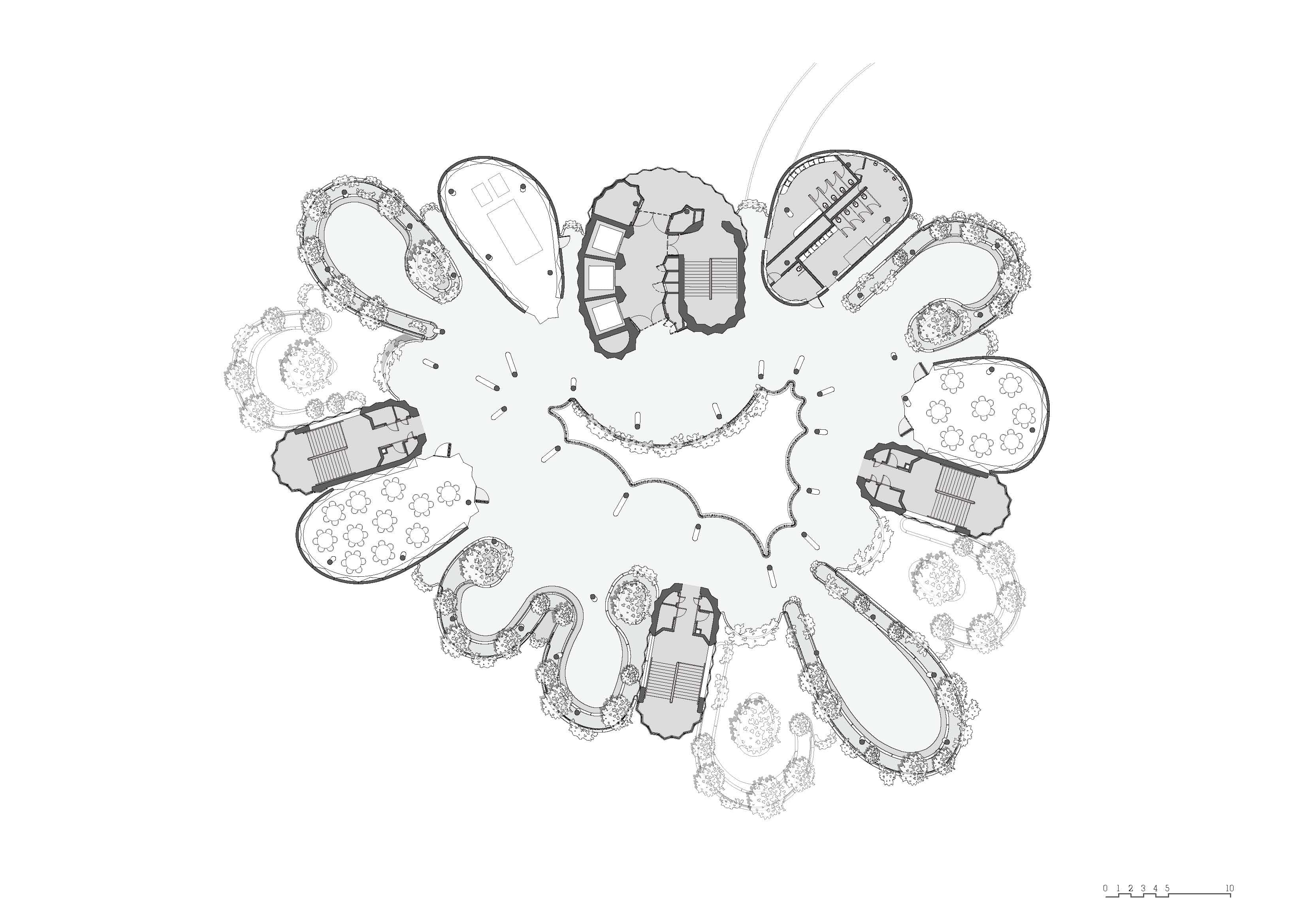 The 12 towers are made up of stacked classrooms, designed to blur the hierarchy between teacher and student divisions. There is no discernible front and back of the room, encouraging a more interactive environment that disintegrates the top-down model of pedagogy. The classroom spaces are interwoven with intimate nooks, plant-filled balconies and large circulation areas that act as social gathering spaces and are seen as equally important informal learning environments.
