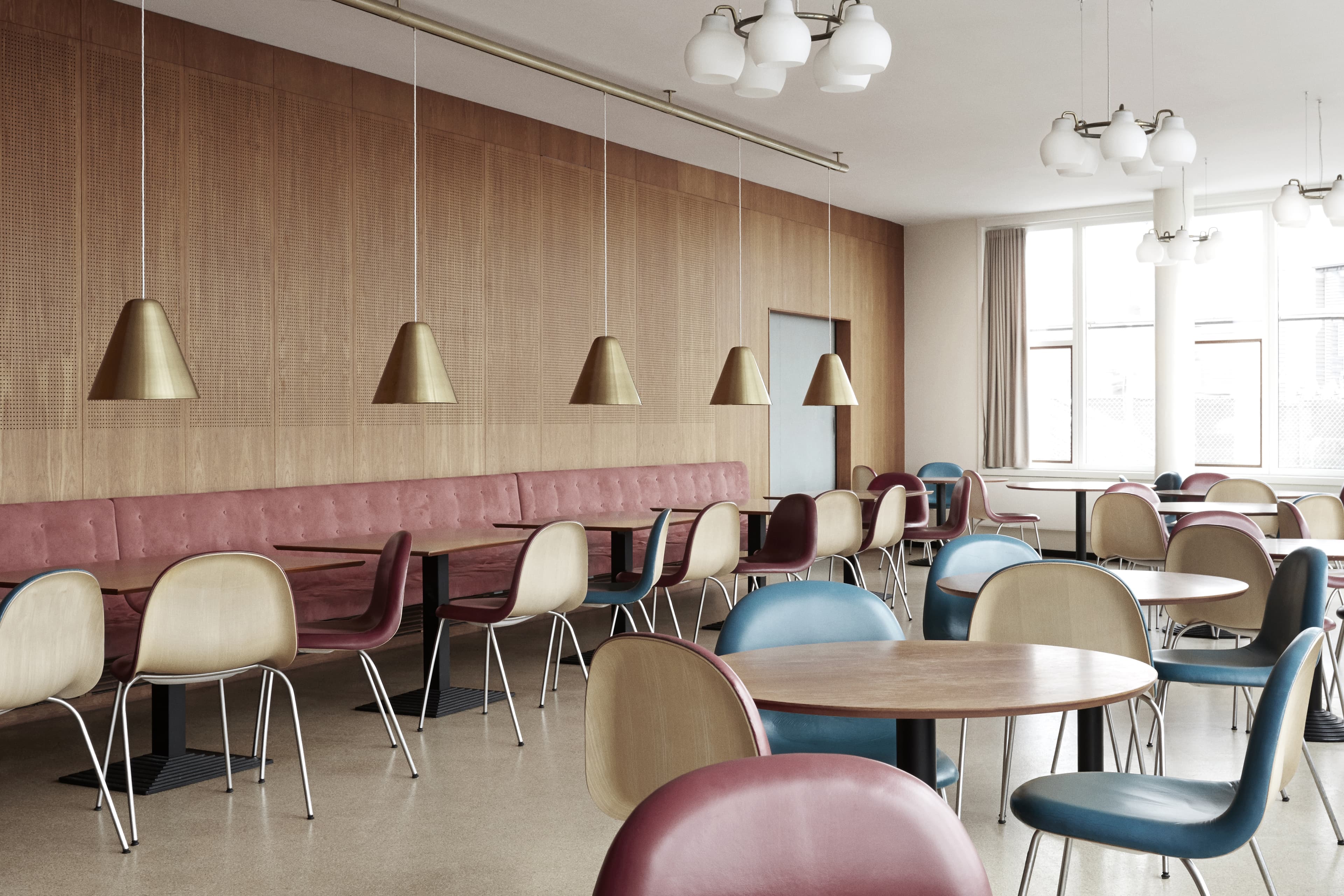 The materials in the airport terminal are not as exclusive as in Radiohuset, which Vilhelm Lauritzen designed and built concurrently with the terminal. The only exceptions are the brass banister along the staircase and the Greenlandic marble at the entrance, which resists wear from the many suitcases. The facade is white fiber cement, and the floor is clad with rubber. In addition to the building itself, Lauritzen also designed the lighting and decor in collaboration with furniture designer Finn Juhl. Together, they designed everything from lamps and furniture to ashtrays and signs for all terminal functions.