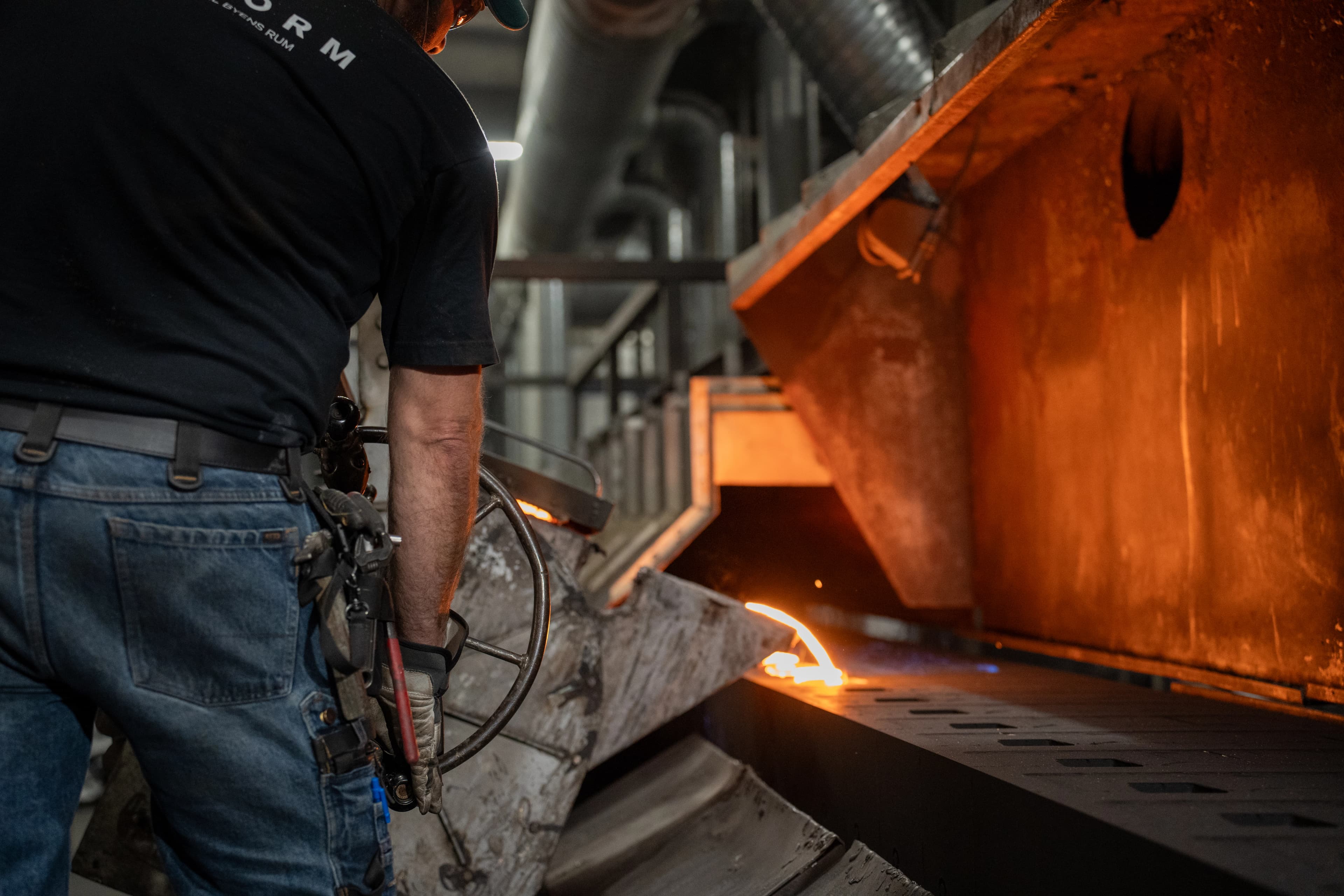 It’s just past 9:30 a.m., and the heat continues to rise. Klaus and his colleagues have been here since 5 a.m., pulling on their work gear – a T-shirt and a pair of giant gloves that act as shields against the glowing metal.