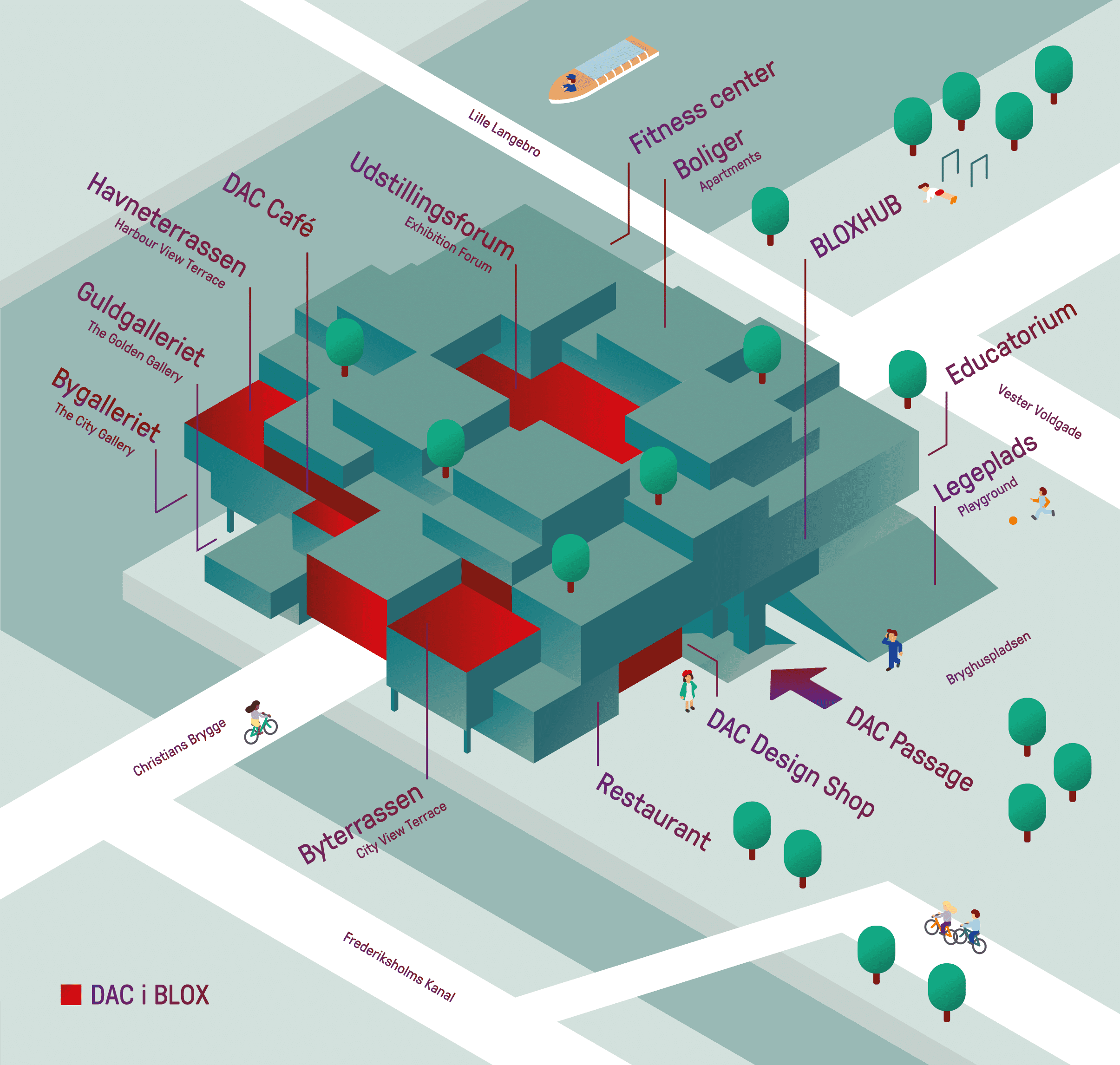 DAC is located at the heart of BLOX, which also includes offices, a fitness center, restaurants, and 22 rental apartments at the top. DAC has three exhibition galleries, our children’s universe Educatorium, conference rooms, the art installation DAC Slide, a Design Shop, and spectacular views of the city from the café and its large rooftop terraces.
