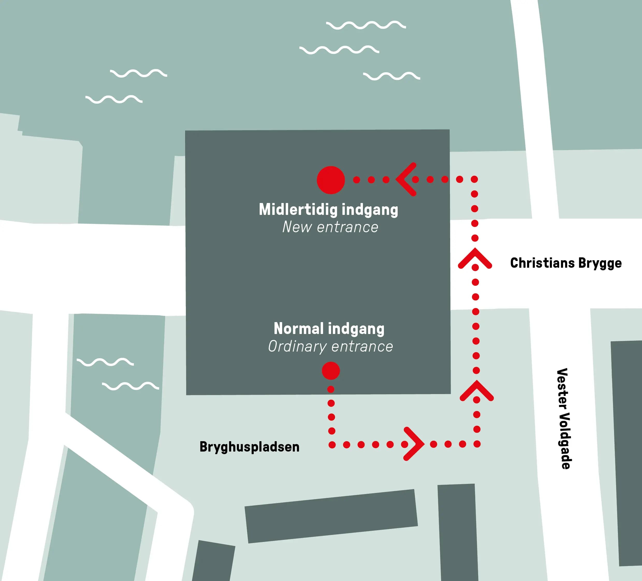 Follow the signs from Bryghuspladsen to the temporary entrance, or search for Christians Brygge 27 in your map app. There is also a lift at the temporary entrance. We expect to reopen the main entrance from Tuesday, 3 March.