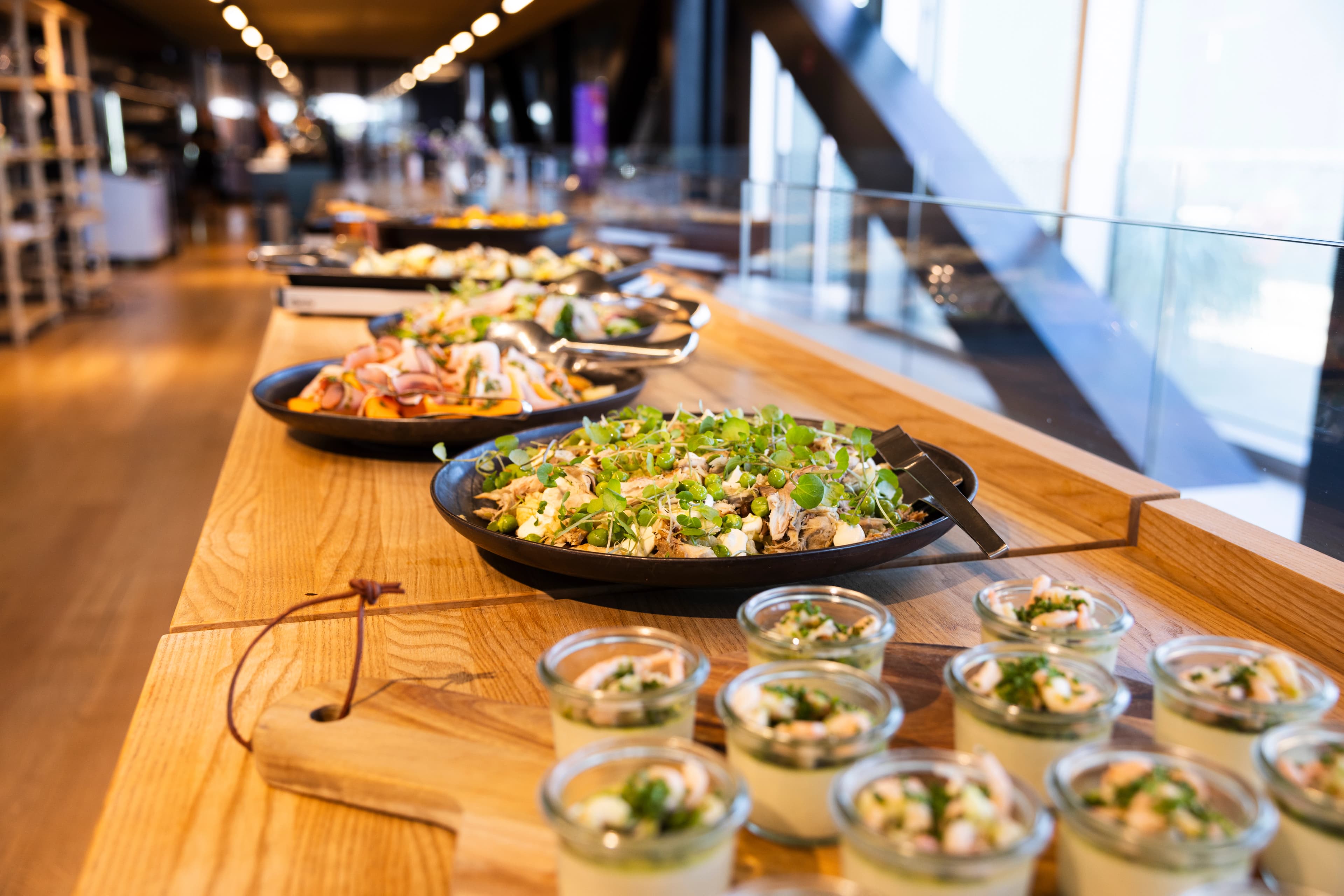 Vi tilbyder indbydende buffet og smuk scenografi. Velkomstdrink, øl, vin og vand er inkluderet hele aftenen, hvis I ønsker cocktails, kan vi også arrangere det.