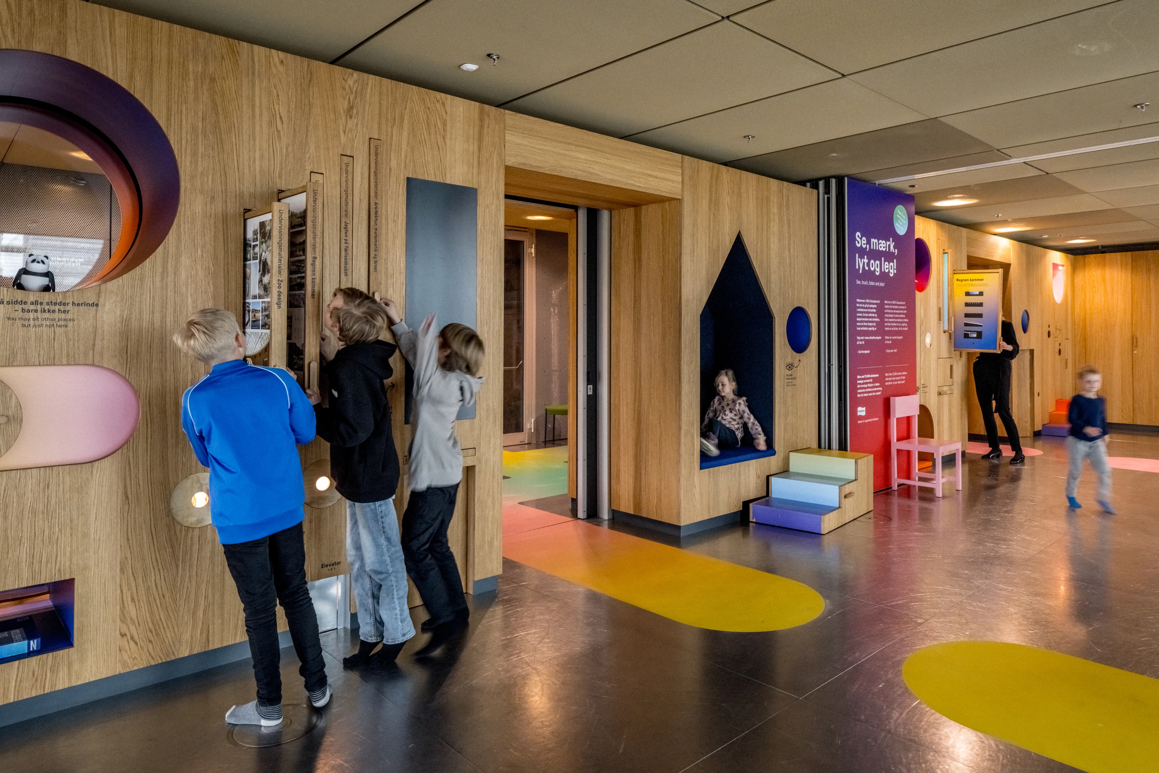 Educatorium er DACs børneunivers. I hverdagene benyttes det af skoleklasser. I weekenderne er det her vi tilbyder familieworkshops. Educatorium finder du på samme niveau som Forum, nemlig U2. Der er en lille trappe ned. Ved siden af trappen er en lift, så man med kørestol eller barnevogn kan komme op og ned ad trappen.