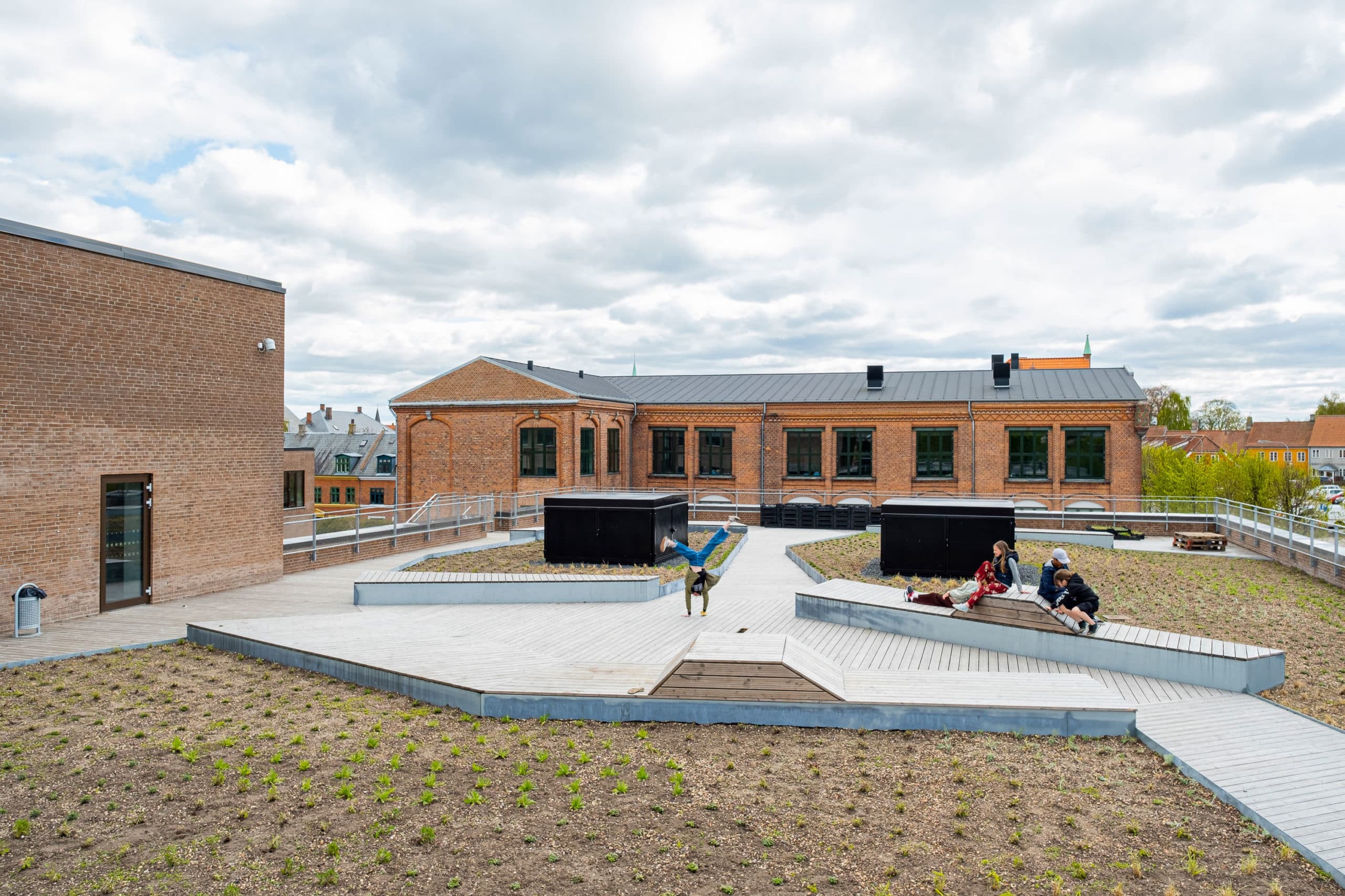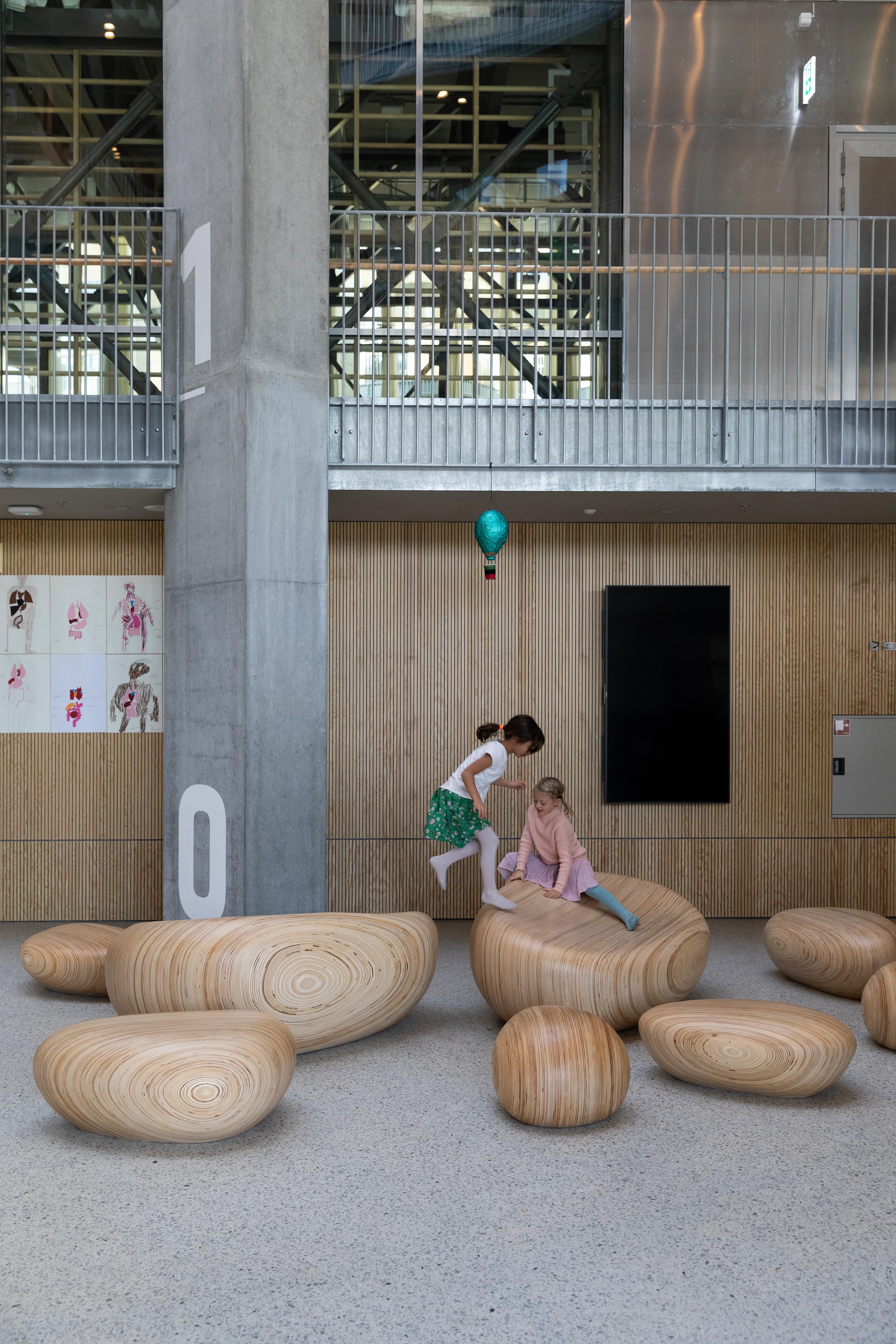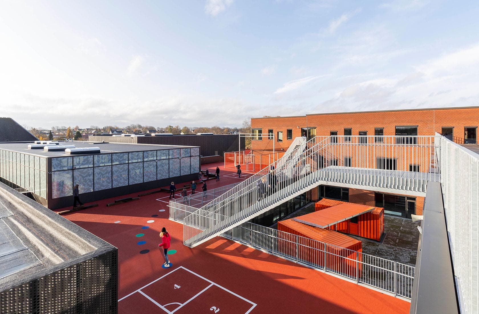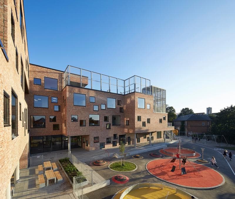 Frederiksbjerg Skole ligger midt i det pulserende byliv i Aarhus, og det mærker man med det samme. Bygningen er designet, så børnene naturligt bevæger sig i løbet af dagen: De kan klatre, balancere og lege sig gennem skolegårde, trapper og gangarealer.