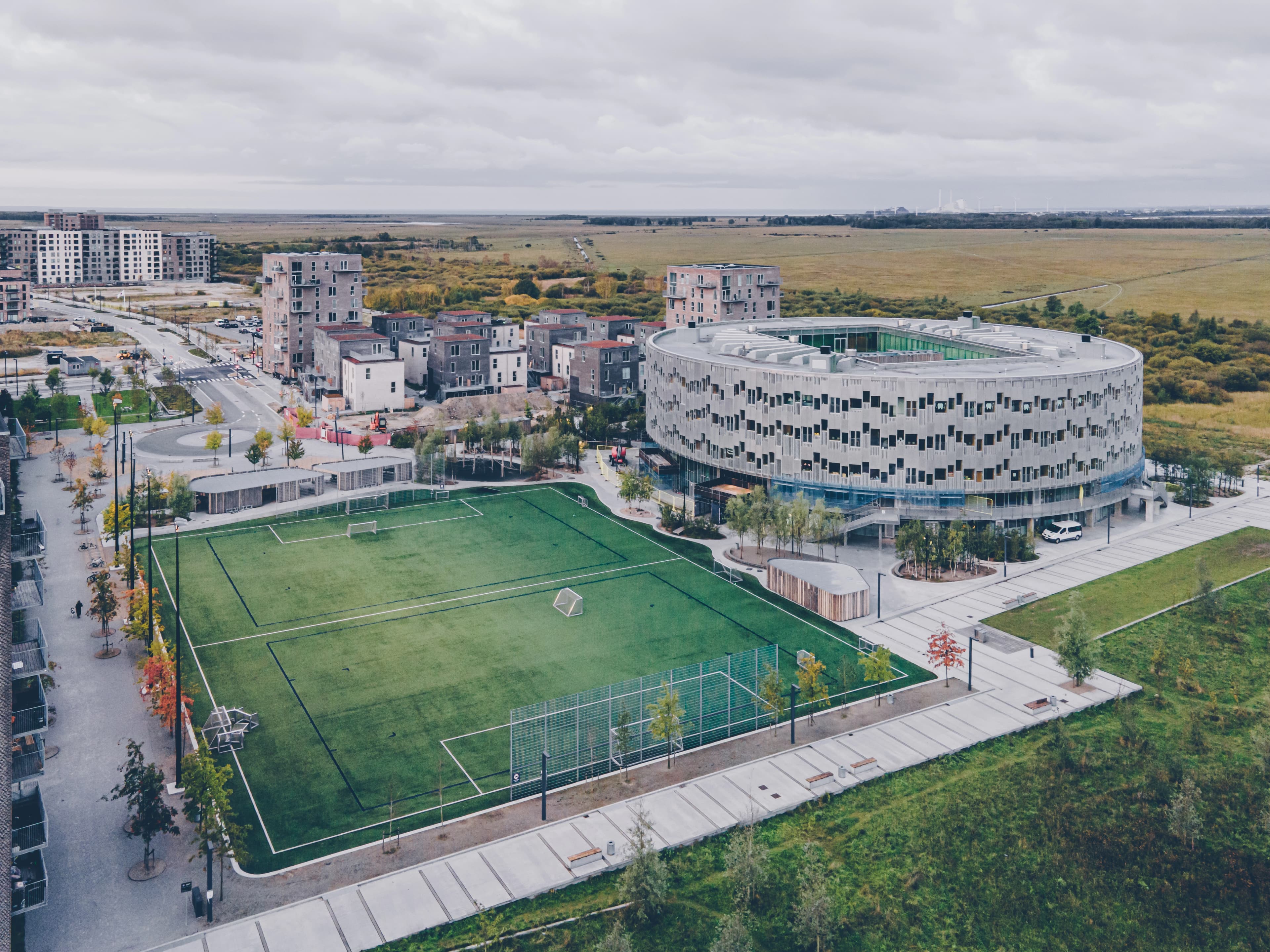 Skolen er opført som en cirkulær bygning, der åbner sig mod både Kalvebod Fælleds natur og det urbane Ørestad. Rundt om bygningen breder udearealerne sig ud som et bølgende landskab i beton, beplantet med grønne elementer og snoede stier, der indbyder til spontan leg og bevægelse i det fri.