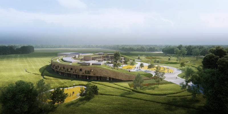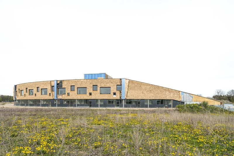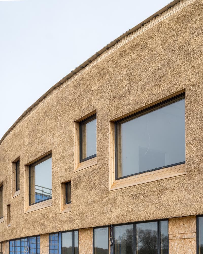 Bygningens cirkulære form er inspireret af vikingetidens ringborge – en form, der skaber et beskyttet gårdrum. Facaden er stråtækt med lokalt halm, hvilket hylder egnens byggetraditioner.