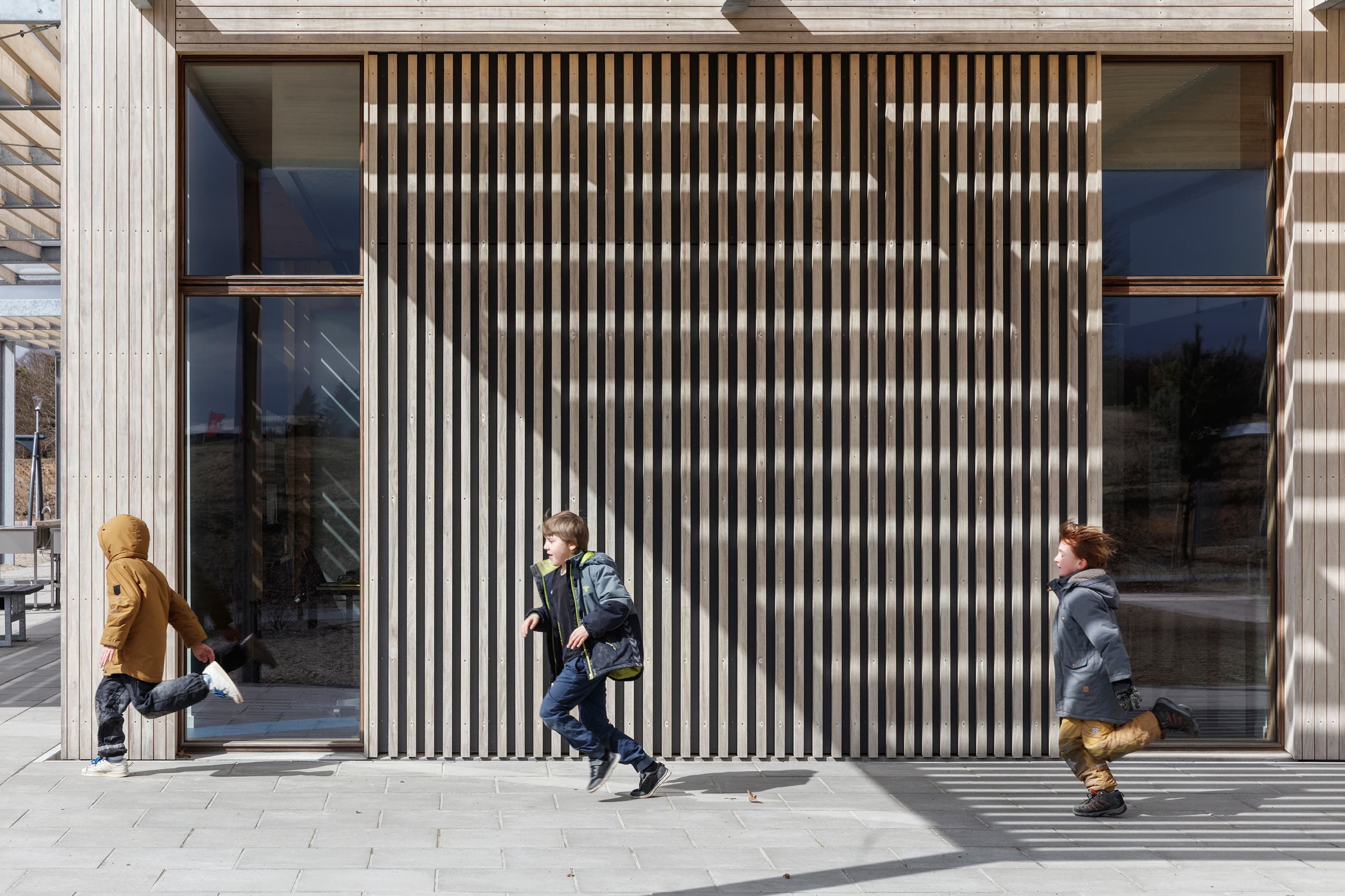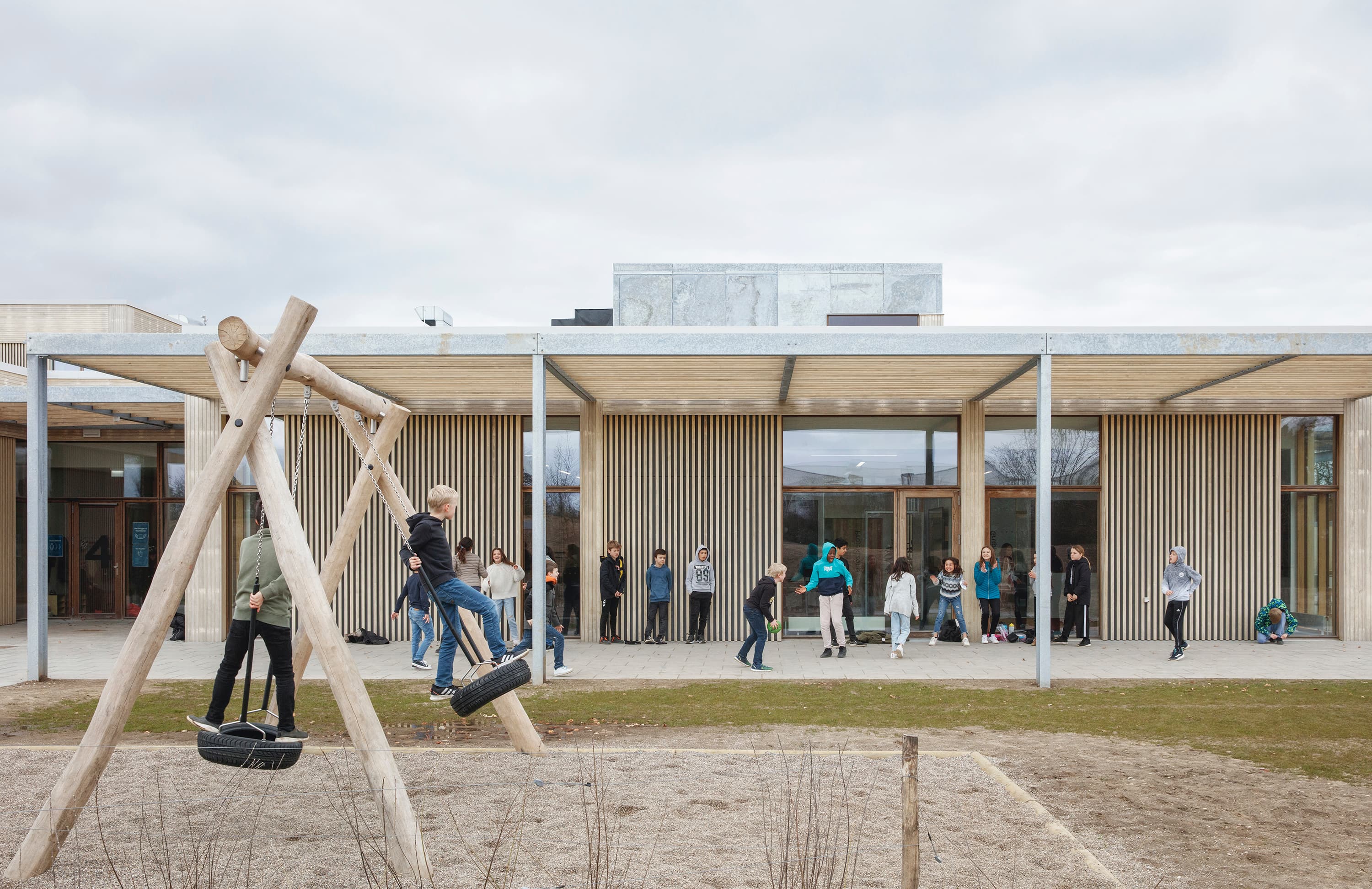 På Erlev Skole er det ikke kun eleverne, der skal tænke kreativt – det gør bygningen også. Skolen er bygget af træ med en synlig søjle struktur på facaden.