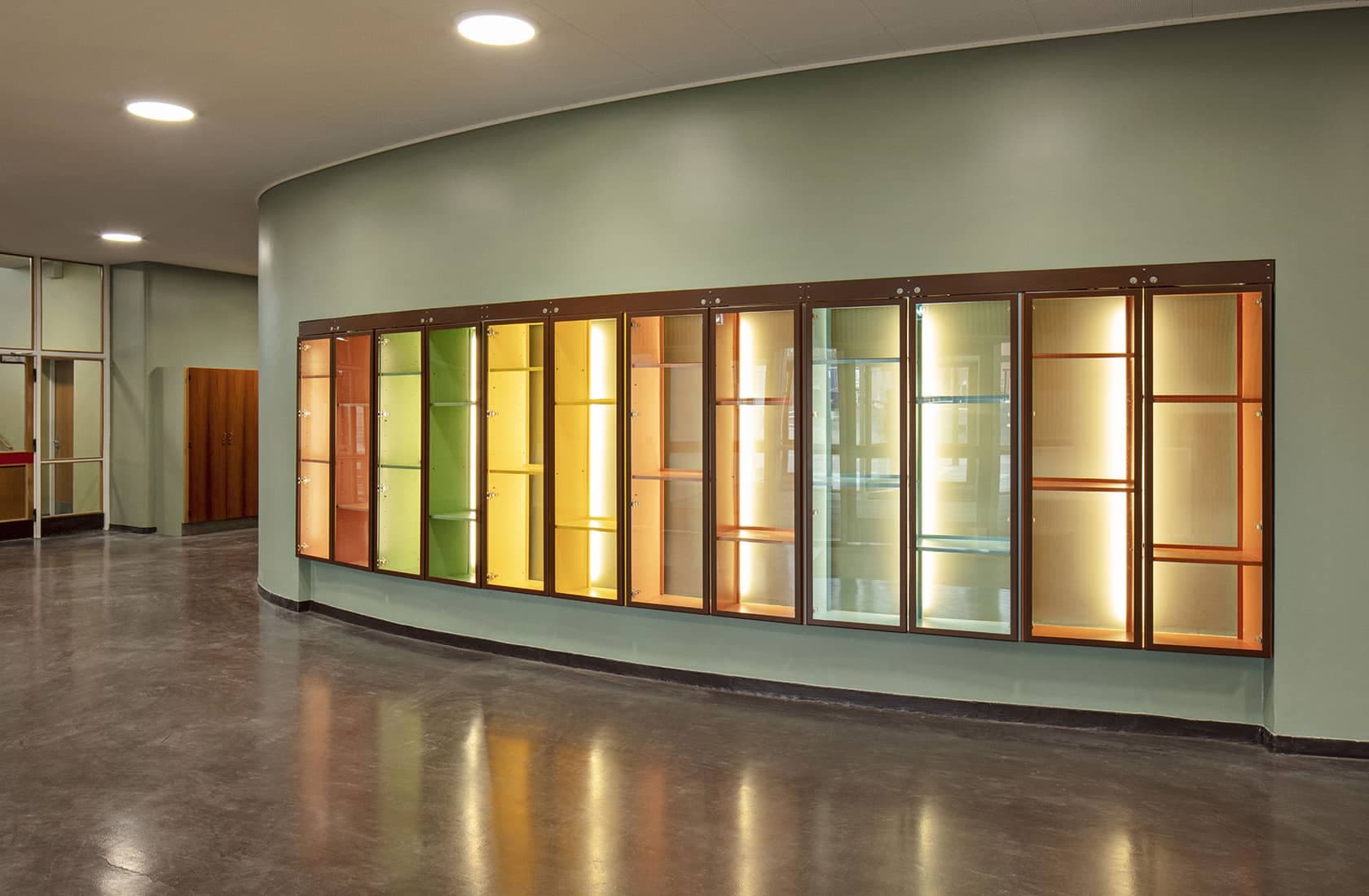 Den bevaringsværdige skole fra 1943 er nænsomt renoveret med respekt for de originale detaljer – gamle trædøre, skabe og stengulve er bevaret. Farvepaletten i dæmpede blå, grønne og røde nuancer skaber ro og spiller smukt sammen med træ og naturmaterialer.