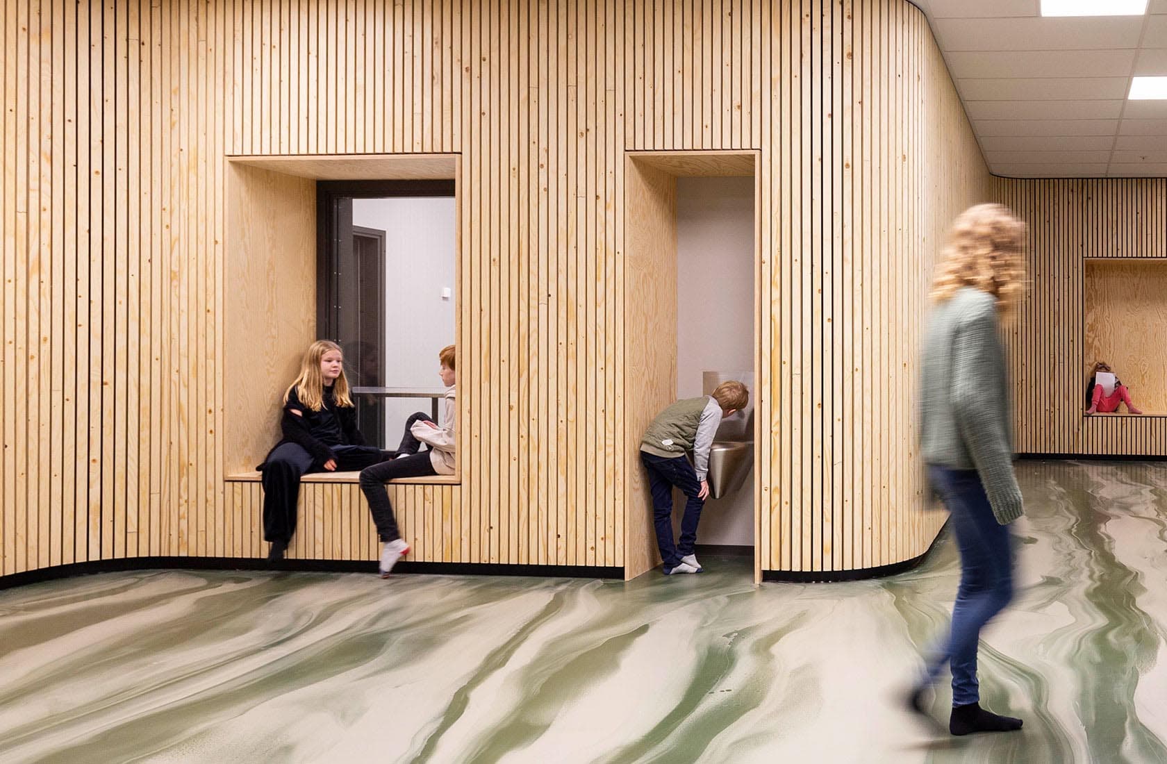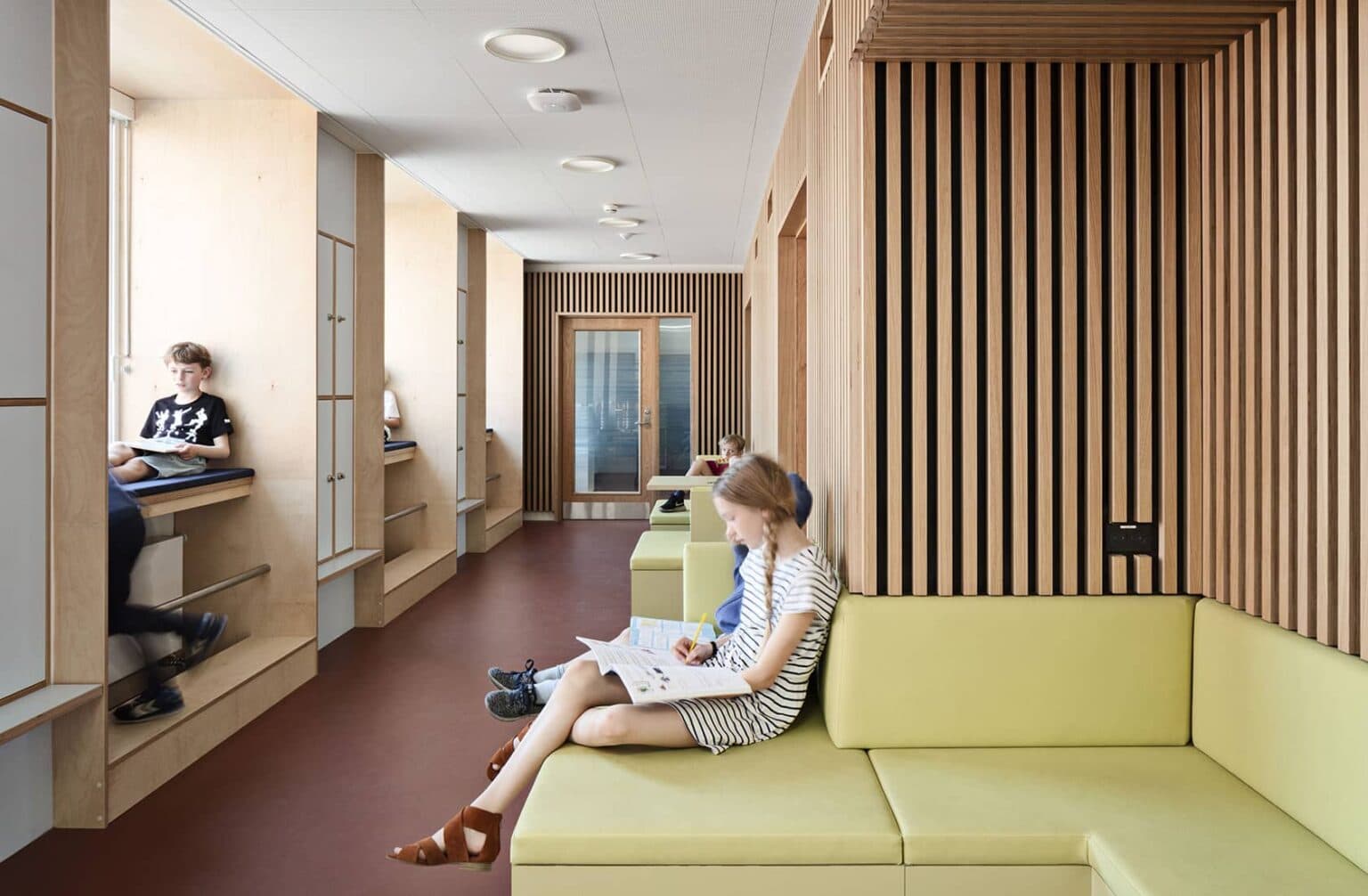 Overalt er læringsmiljøerne tænkt til at rumme alle – med indbyggede nicher, brede vinduespladser og fleksible opholdssteder, der understøtter både fællesskab og fordybelse.