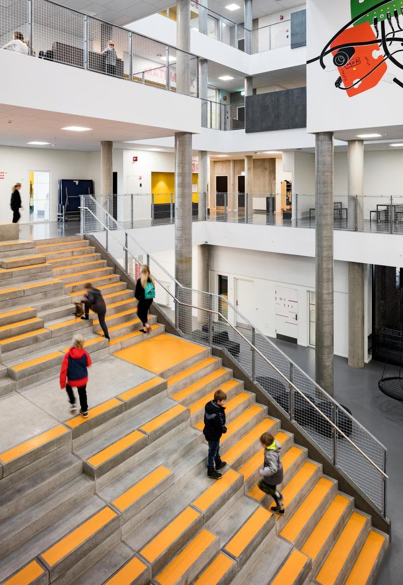 Indvendigt bindes etagerne sammen af et stort, åbent atrium, hvor eleverne kan mødes på tværs af klassetrin.