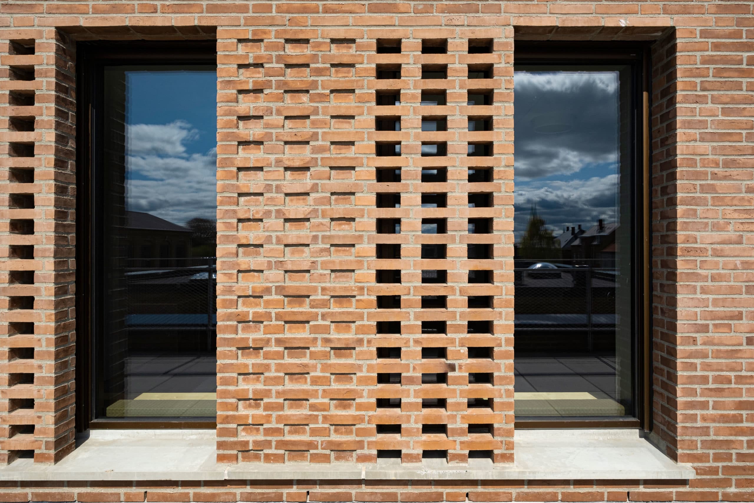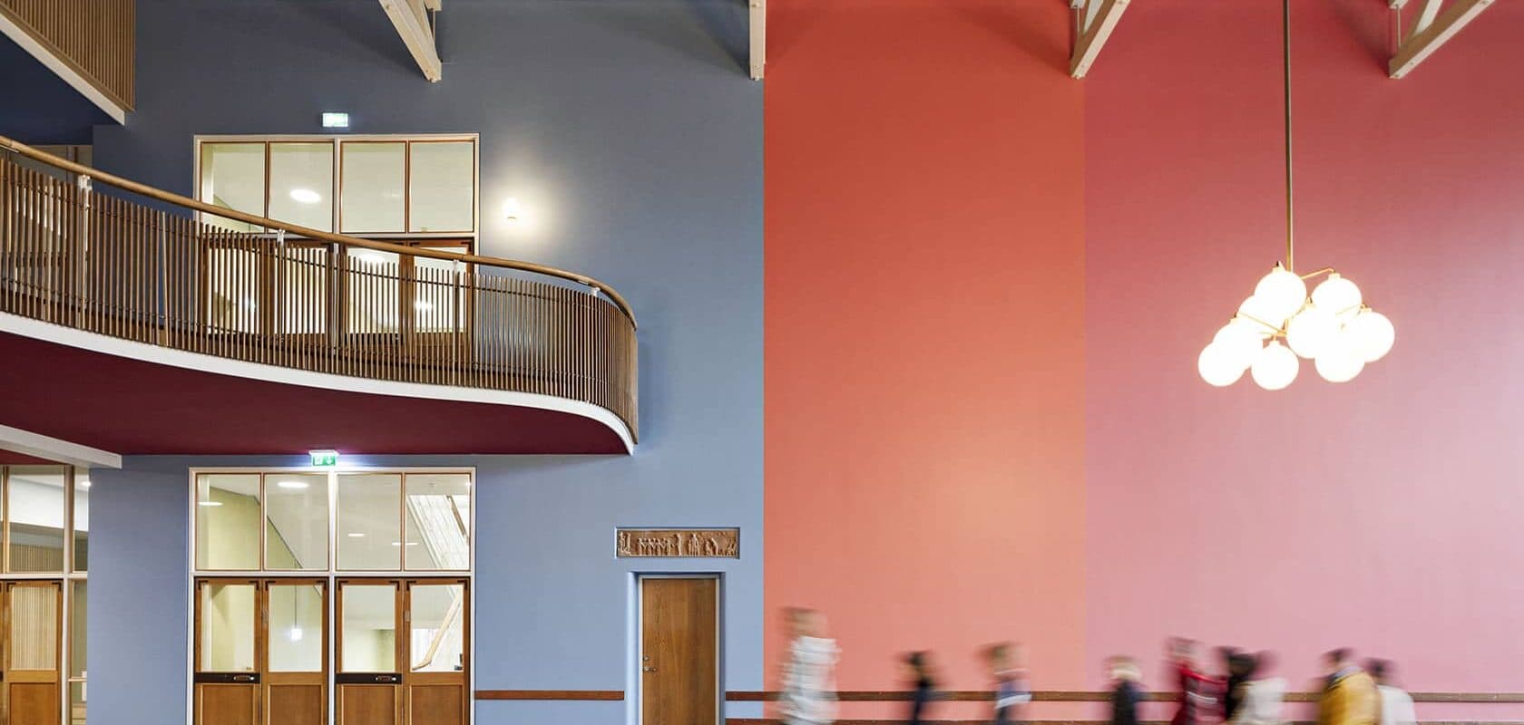 Nye tilbygninger trækker tråde til de oprindelige huse med detaljerig tegl. Indenfor er rummene åbne, lyse og fleksible – her er glas, nicher og møbler, der let kan tilpasses forskellige undervisningsformer.