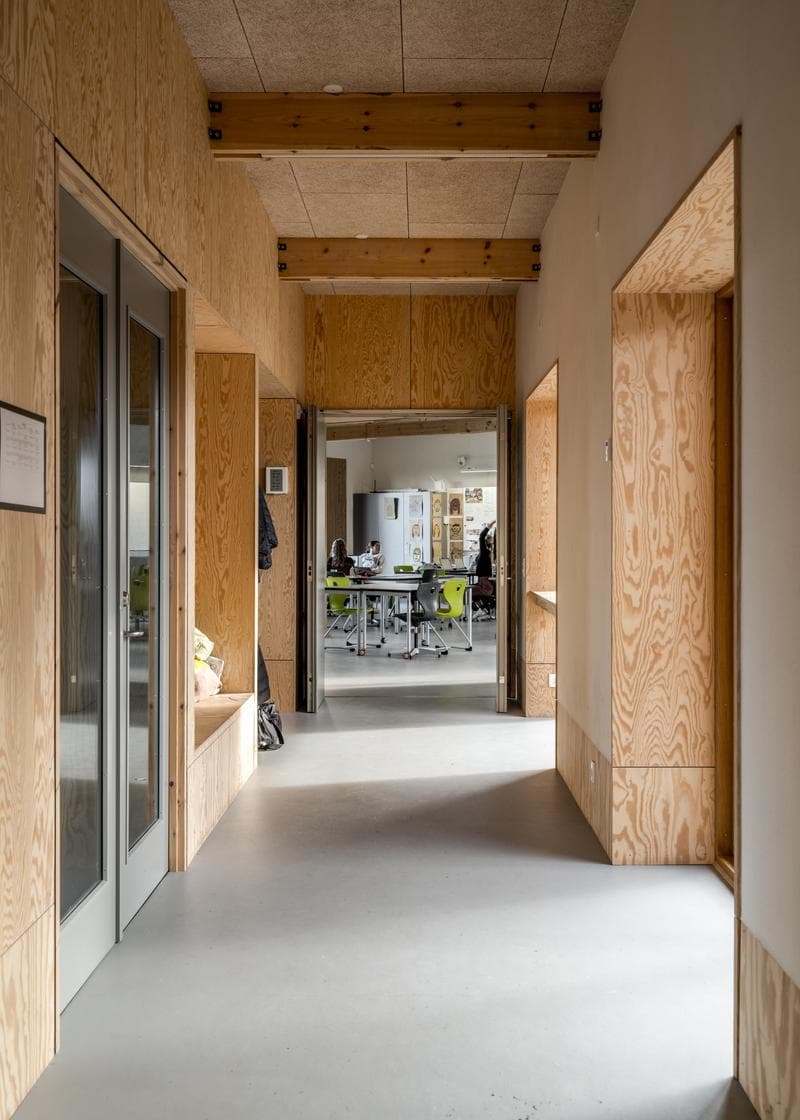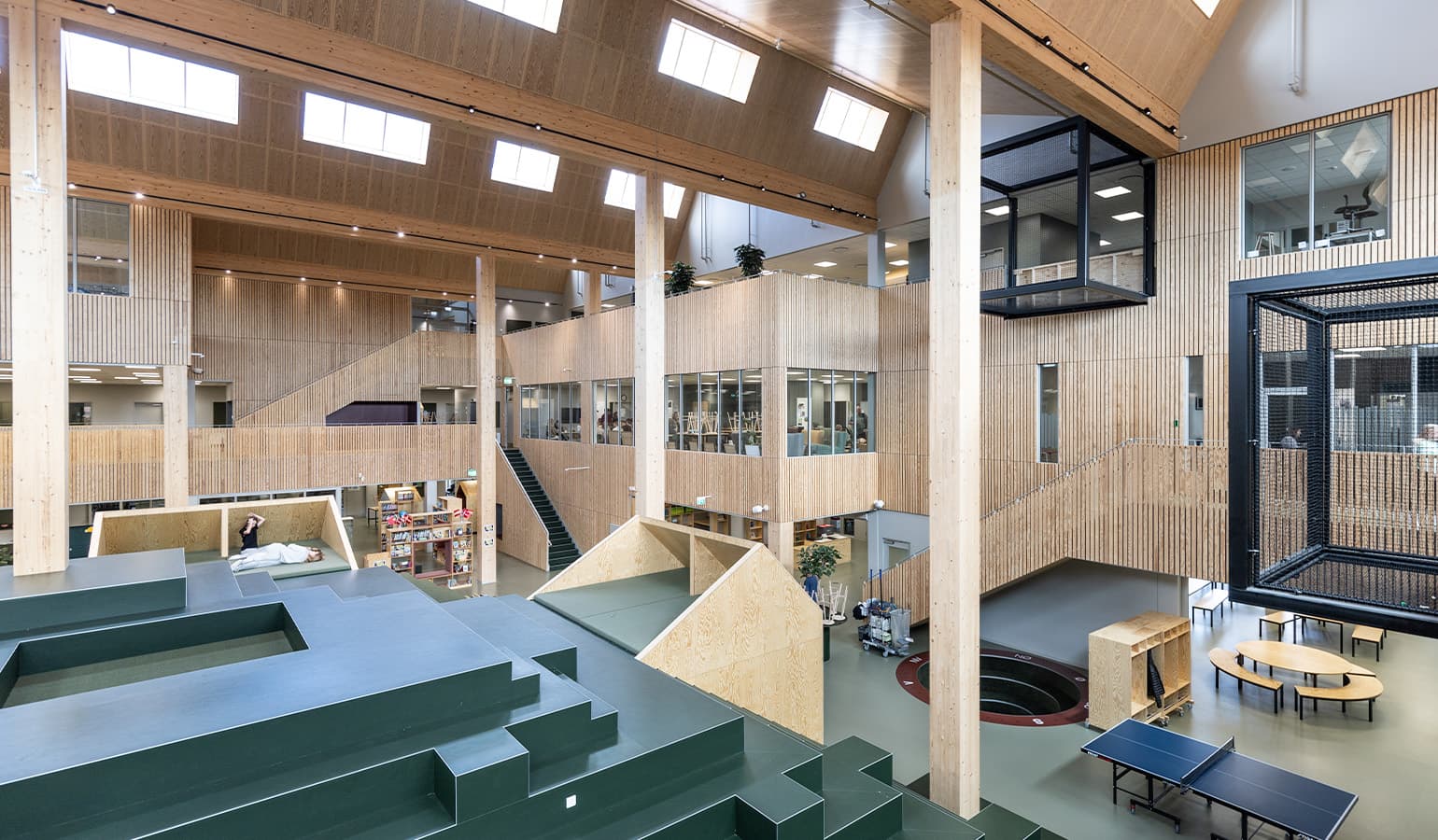 Træet går igen indenfor, hvor både vægge og trapper er konstrueret i træelementer, som giver en lys og luftig fornemmelse i de store fælles rum. Der er skabt plads til forskellige arbejdsstationer, så der er plads til at lære på gulvet, i små hyggekroge og i skolegården.