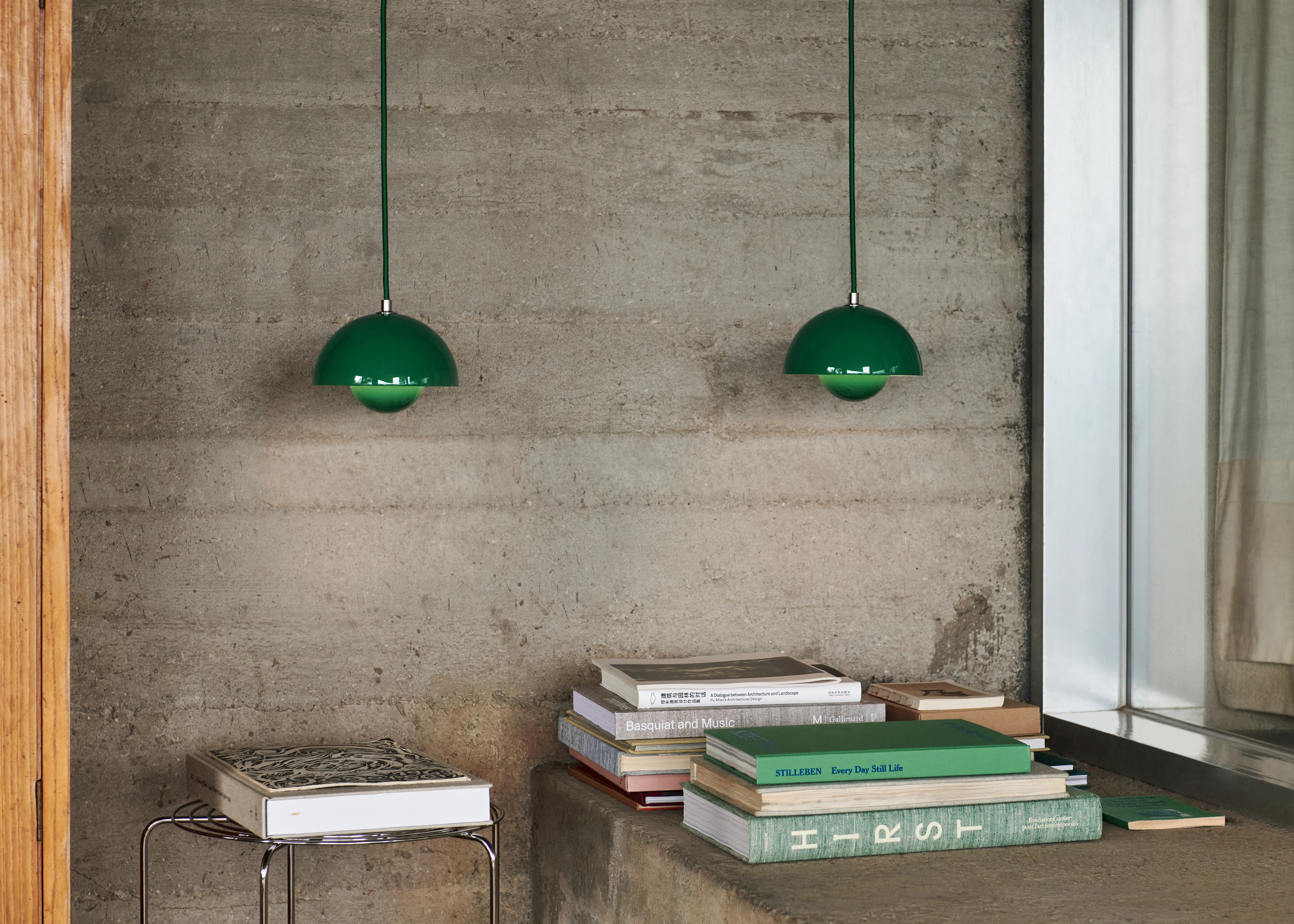 Efter sin debut på den første Visiona-udstilling i 1968 blev Flowerpot-lampen øjeblikkeligt sat i produktion hos Louis Poulsen. De to halvkugleformede skærme skaber et blødt, indirekte lys og en enkel, grafisk silhuet. Lampen blev et symbol på tidens optimisme og Pantons ambition om at bringe farve og form ind i hverdagen.