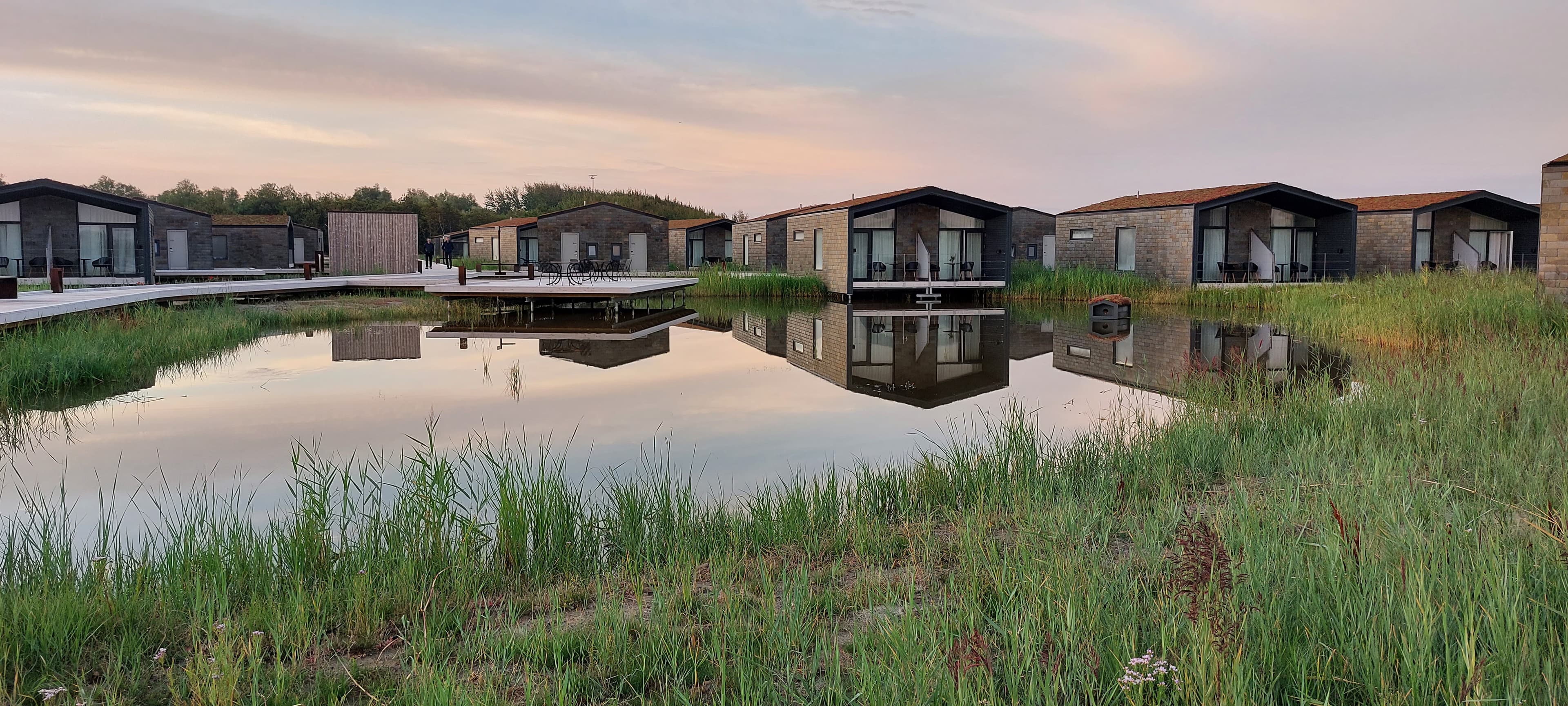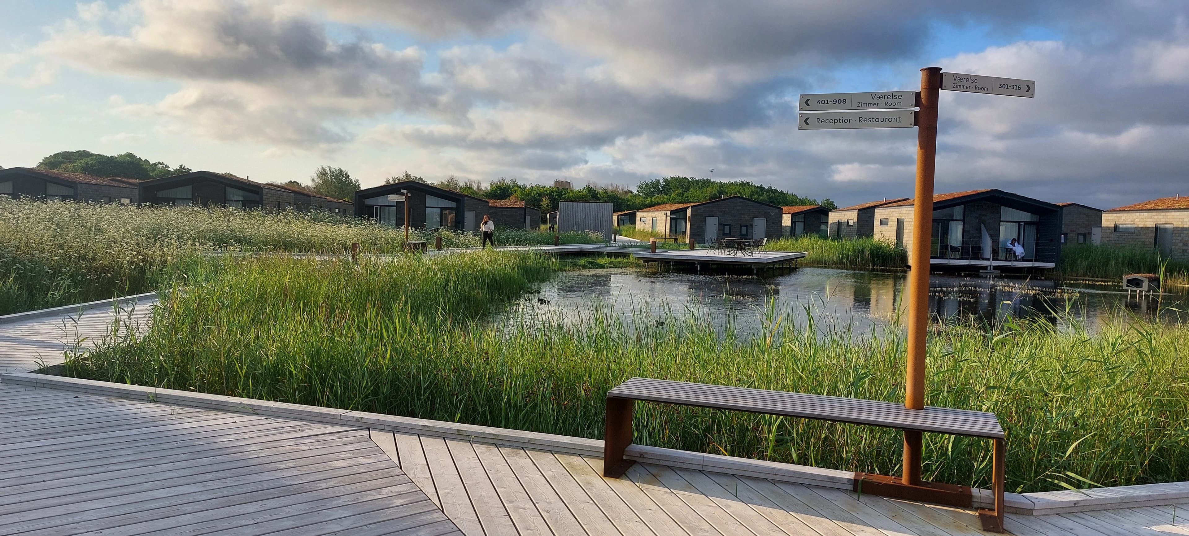 Midt i Lollands vilde vådområder ligger Hages Badehotel som en arkitektonisk hyldest til at bygge på naturens præmisser. Hotellet er bygget på pæle hævet over jorden. Ved at hæve bygningerne over terrænet undgår man at forstyrre den sarte jordbund, og hele området kan i princippet føres tilbage til sin oprindelige form næsten uden spor. Små søer, stier og broer slynger sig som et miniature-Venedig mellem bygningerne, og hver bolig har udsigt til det omkringliggende dyreliv og landskab.