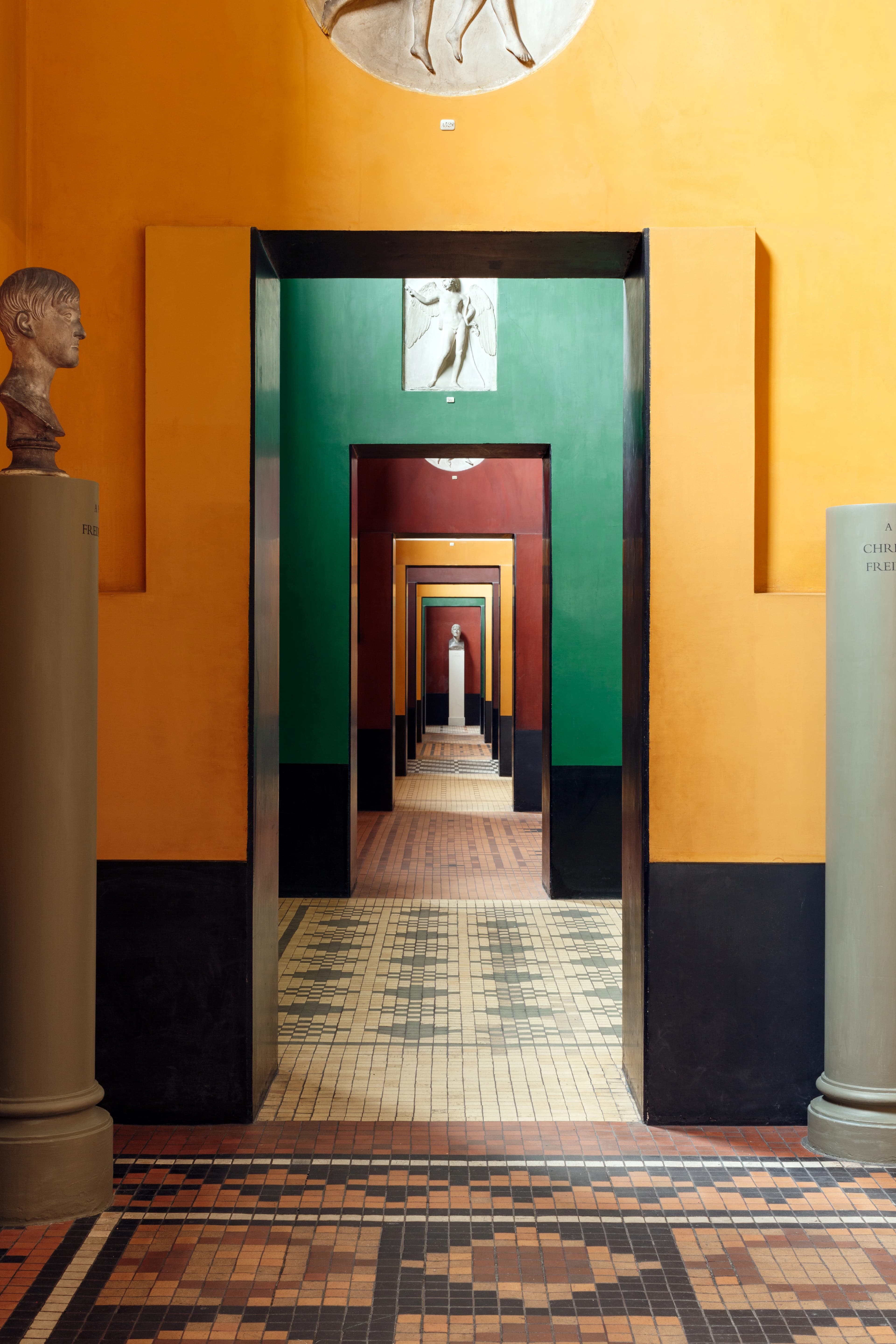 Farver kan fremhæve ideen med et rum. På Thorvaldsens Museum i København har arkitekt M.G. Bindesbøll arbejdet med markante og vekslende udtryk til de forskellige rum. Overgangen fra et rum til et andet markeres både med forskellige terrazzogulve og med væggenes varierende farver.