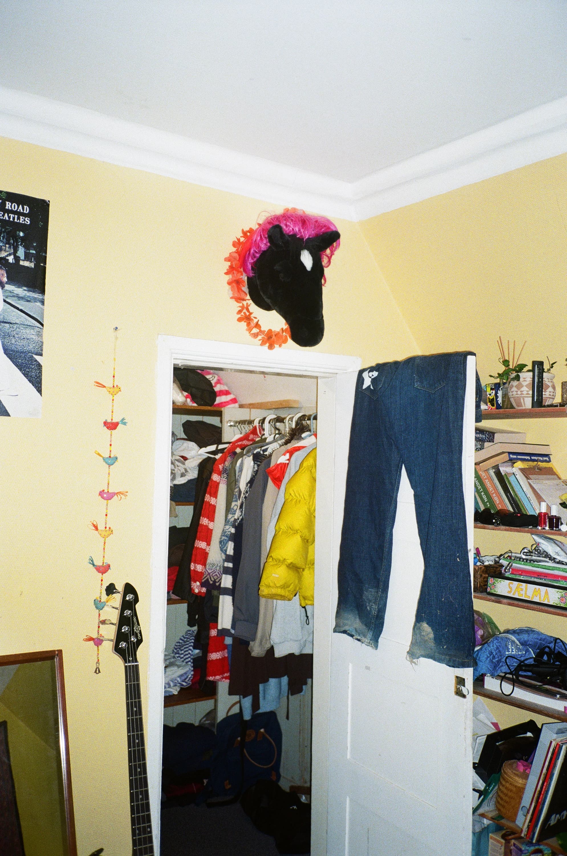 For eksempel er der et billede fra en efterskole, hvor der hænger et sort hestehoved over en dør i et walkincloset. Det fungerer som en dekoration, men jeg forestiller mig, at det er noget, man bare lige har haft ved hånden. Et andet sted er der et baseballbat, der står i indgangen til værelset. Jeg tror ikke nødvendigvis, det er ment som et indretningsobjekt, men samtidig er det heller ikke noget, man har haft brug for at gemme væk.