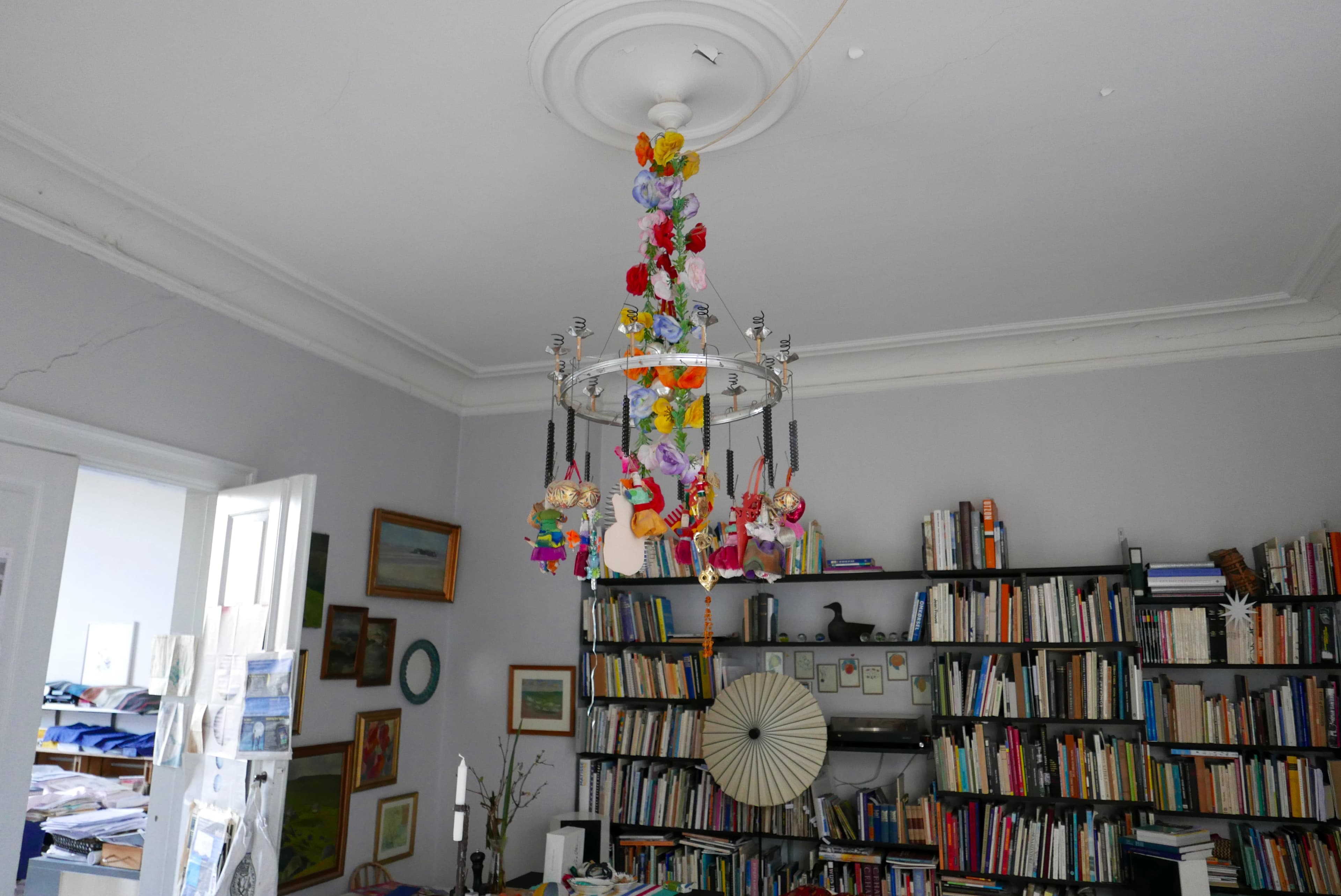Karen Zahle har fulgt mit blik, som er gået i stå ved en atypisk lysekrone, hvor en masse farverigt tingeltangel hænger ned fra.